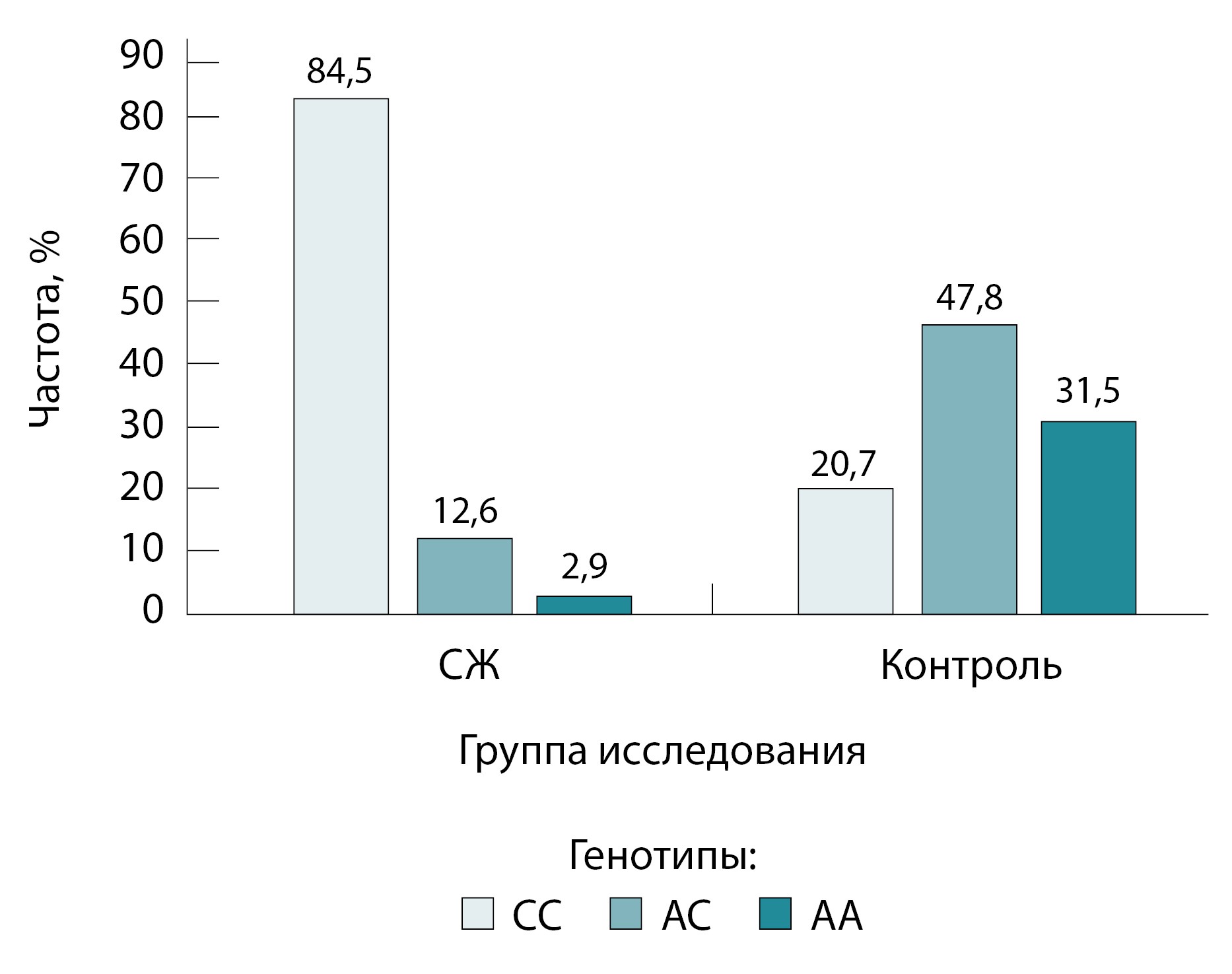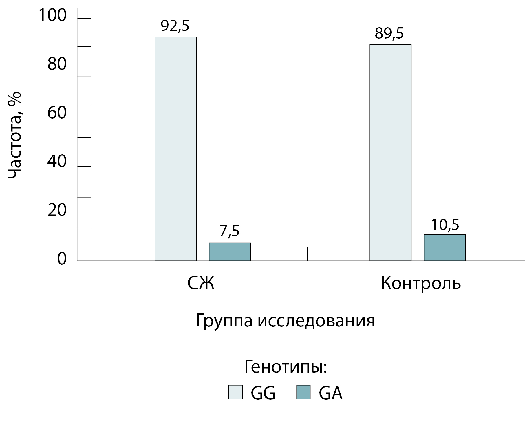 Рис. 2. Частоты генотипов rs4148325 гена UGT1A1 в группе синдрома Жильбера (СЖ) и контрольной группе