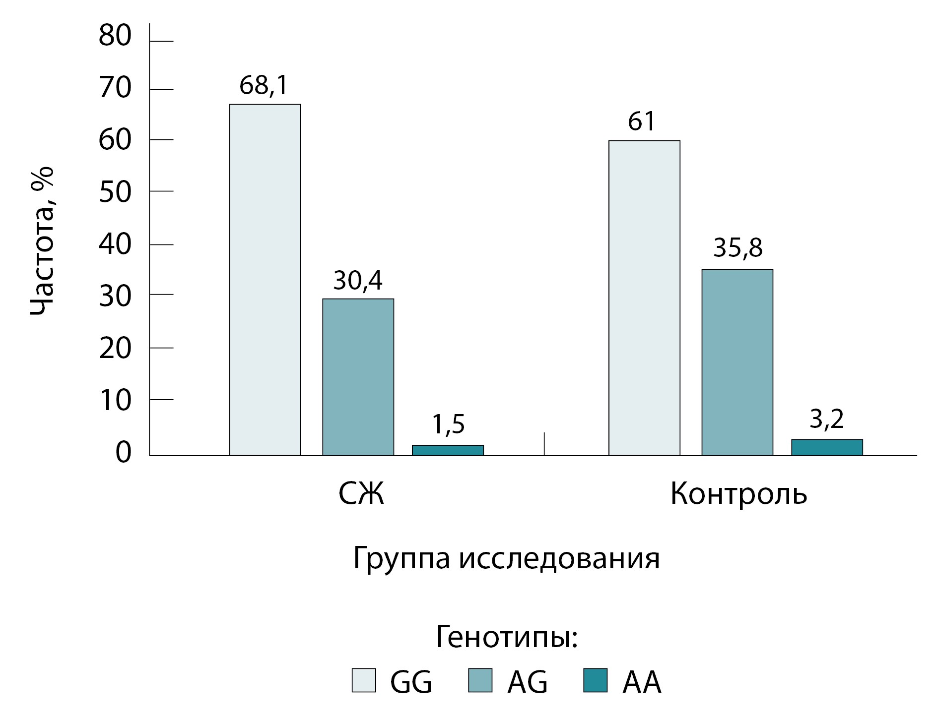 Рис. 4. Частоты генотипов rs16928809 гена SLC22A18 в группе синдрома Жильбера (СЖ) и контрольной группе