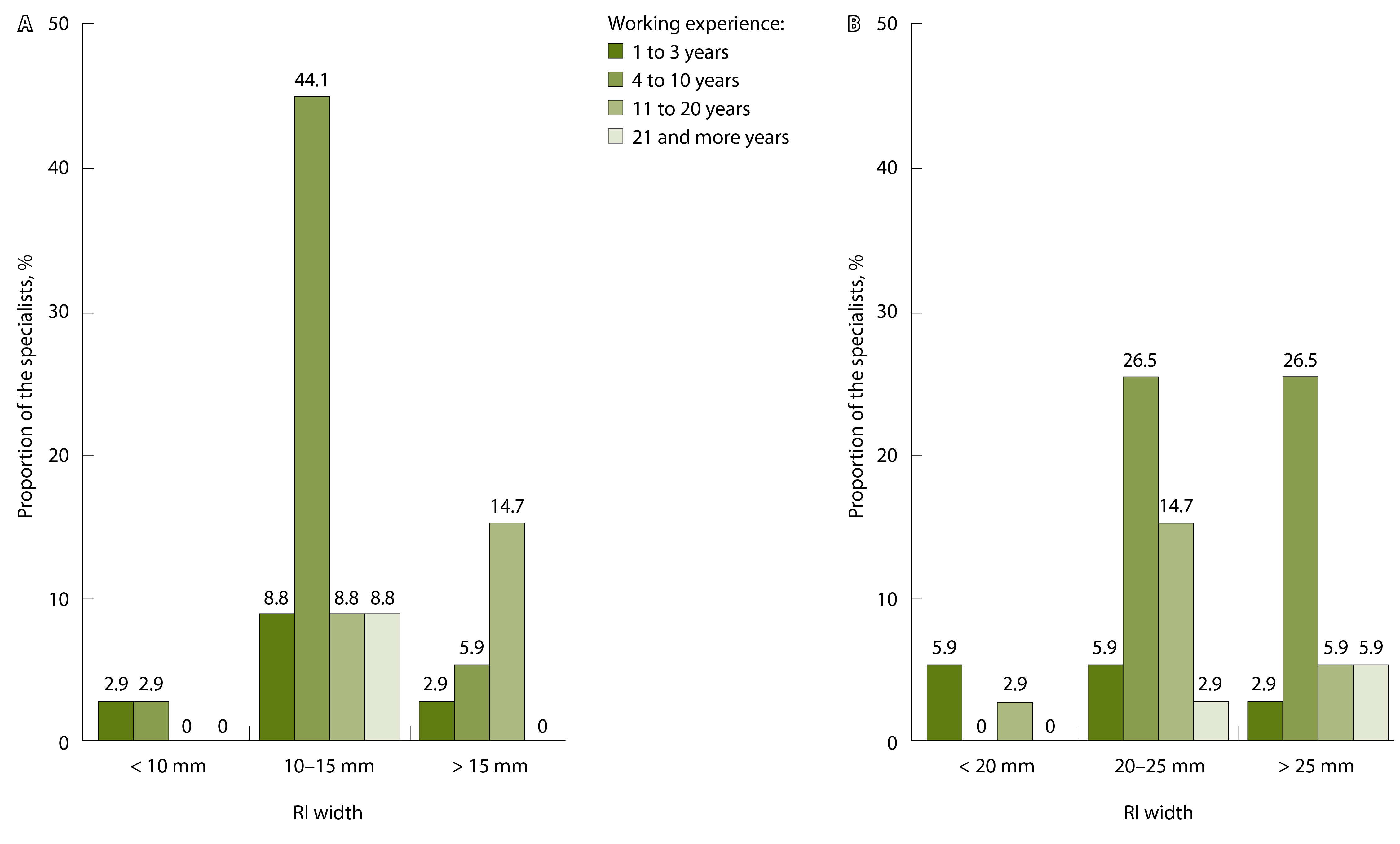 Рис. 3. Распределение вариантов проведения количественной ультразвуковой стеатометрии печени с различием в ширине (А) и длине (Б) региона интереса (РИ) врачами ультразвуковой диагностики (n = 34)