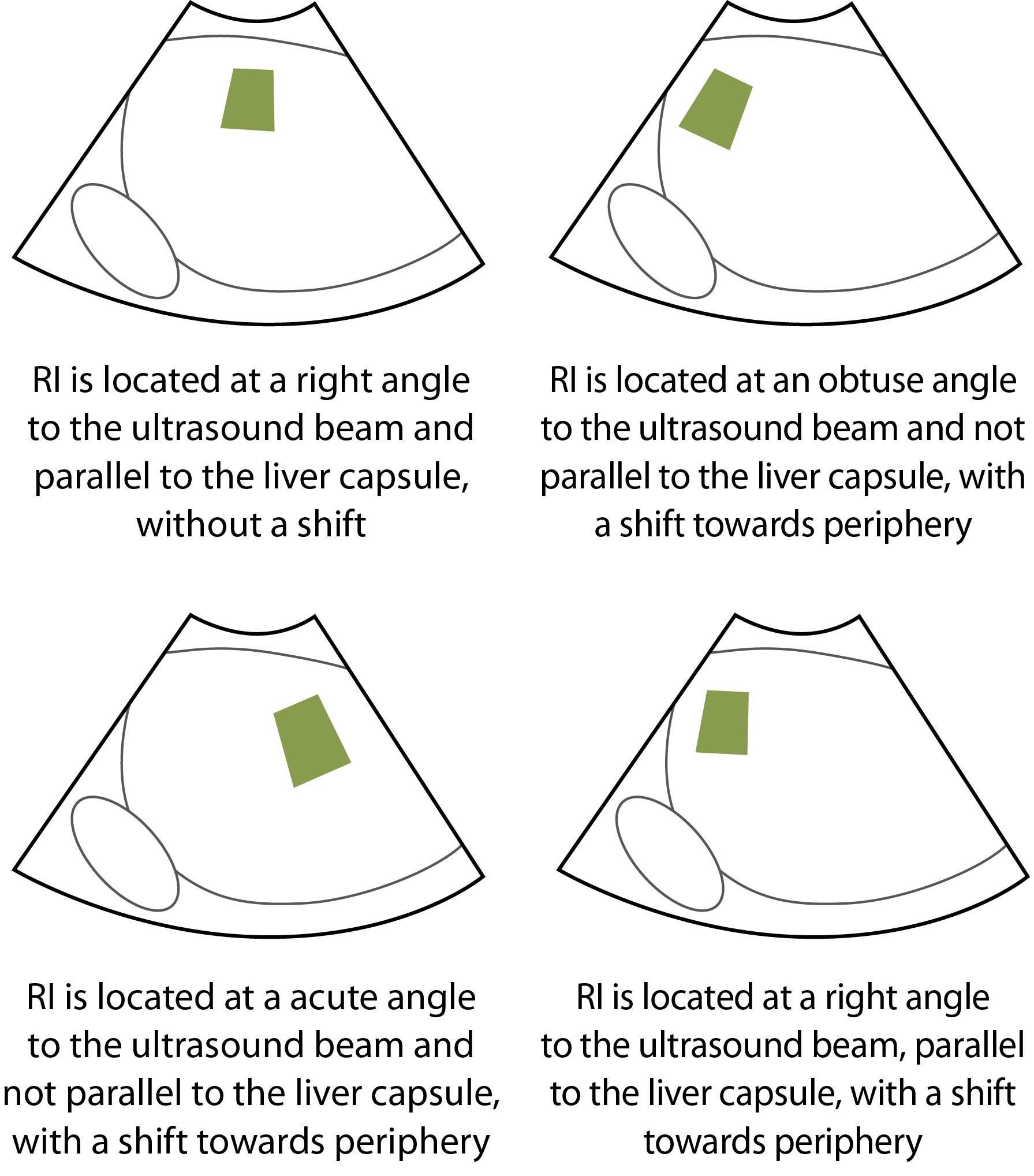 - центральное расположение РИ параллельно капсуле печени, на глубине не менее 10 мм (фиксация верхней границы РИ), под прямым углом к УЗ-лучам для минимизации количества артефактов;