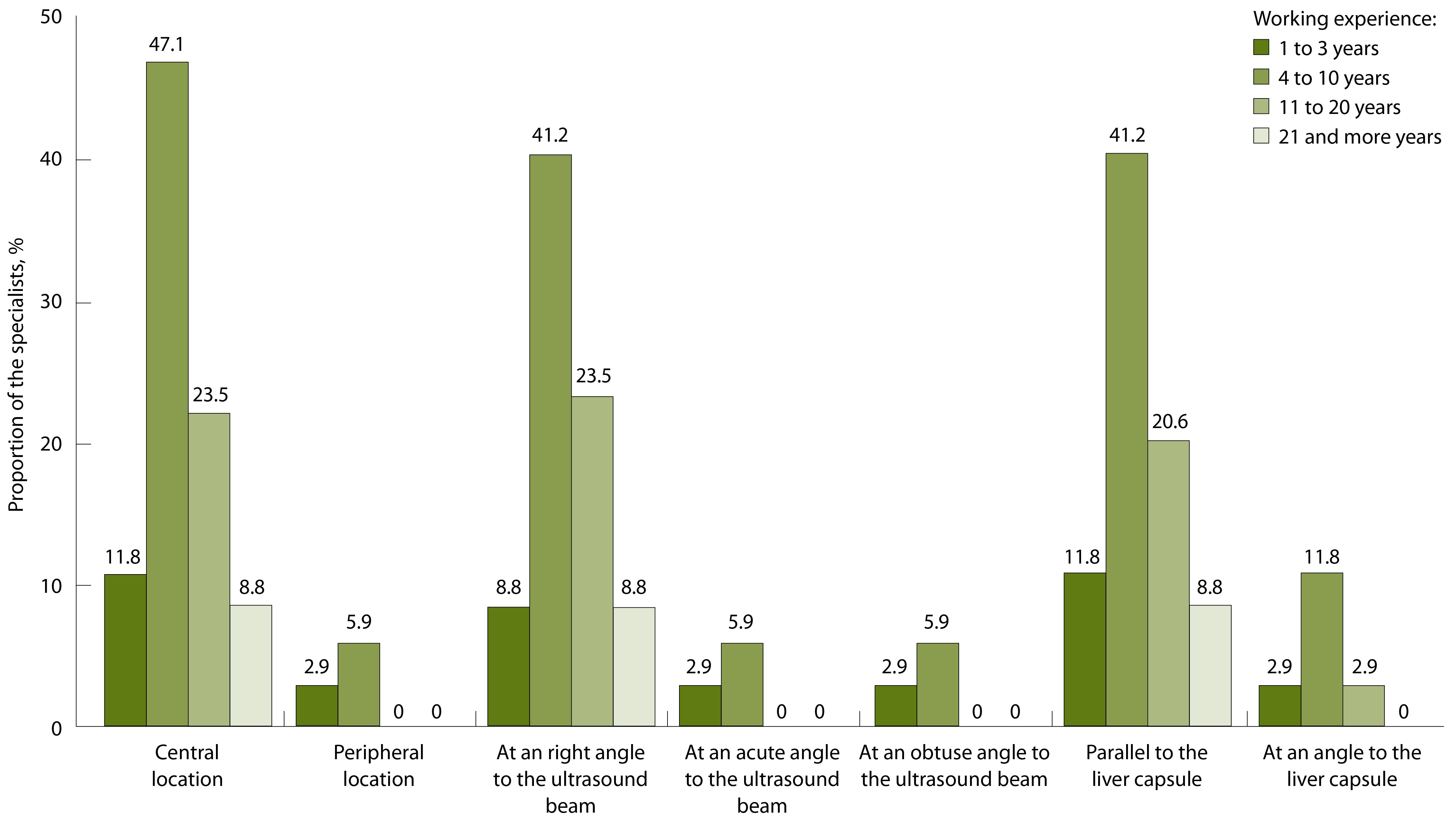 Рис. 8. Варианты проведения врачами ультразвуковой диагностики (n = 34) количественной ультразвуковой стеатометрии печени в зависимости от расположения региона интереса по глубине (А), по отношению к соседним органам и/или структурам (Б)