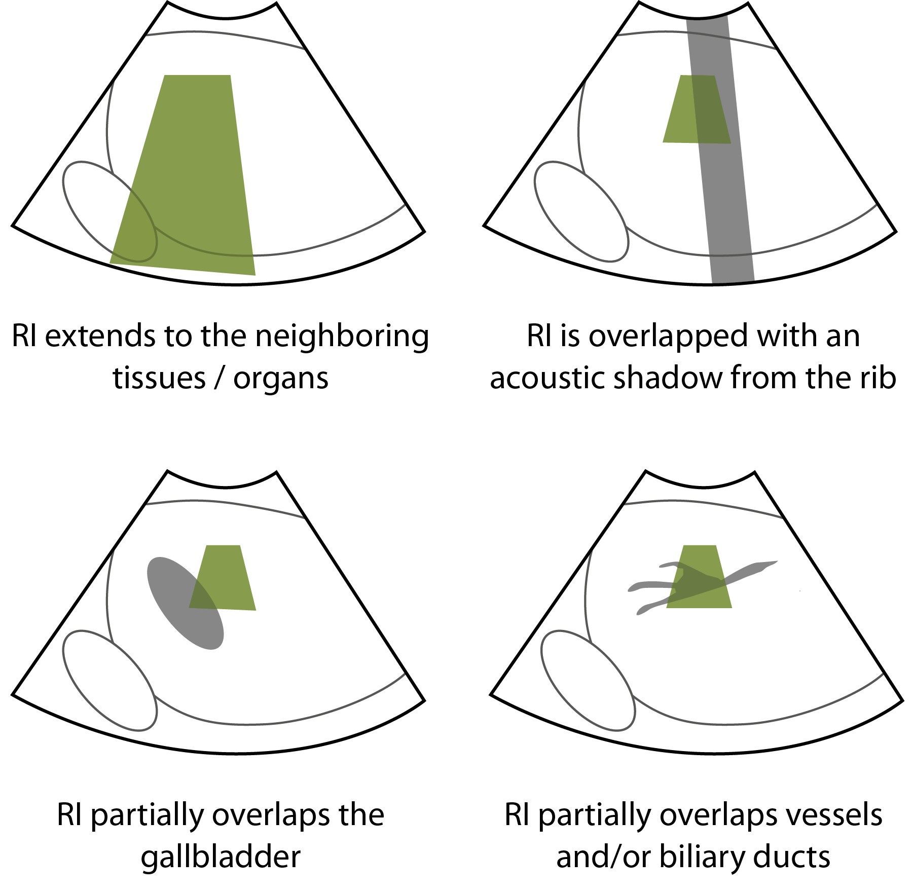 Рис. 7. Варианты проведения количественной ультразвуковой стеатометрии печени с различием в расположении региона интереса (РИ) по отношению к соседним органам и/или структурам