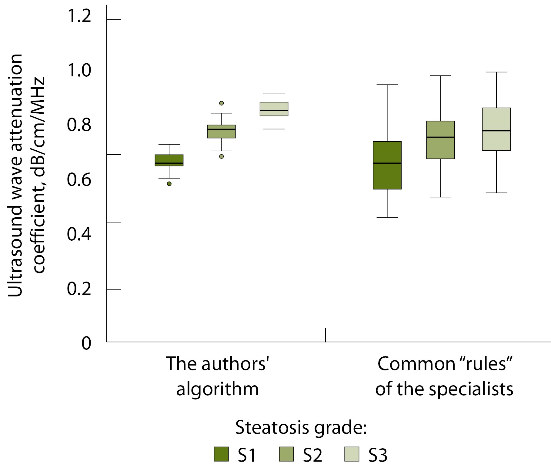 Сравнительный анализ данных количественной УЗ-стеатометрии печени, выполненной по правилам, предложенным авторами, и количественной УЗ-стеатометрии, проведенной по типичным признакам наиболее часто встречающихся «правил» врачей УЗ-диагностики (определены в первой части исследования), выявил более широкие интервалы, в том числе перекрывающие другие, в каждой группе пациентов – с минимально выраженным стеатозом печени (S1), умеренно выраженным (S2) и максимально выраженным (S3) (табл. 1, рис. 10). Статистически значимые различия установлены при диагностике умеренно и максимально выраженного стеатоза печени (p < 0,05) по наиболее типичным «правилам» врачей УЗ-диагностики и по правилам, предложенным авторами статьи. Стоит отметить, что при диагностике всех степеней стеатоза с использованием референсного подхода продемонстрирован наибольший интерквартильный размах коэффициента затухания УЗ-волны по сравнению с предложенной нами методикой. Полученные данные также подтверждаются результатами F-теста Фишера, который показывает неравенство дисперсий при использовании измерений по наиболее типичным «правилам» врачей УЗ-диагностики и по правилам, предложенным авторами (p < 0,05).