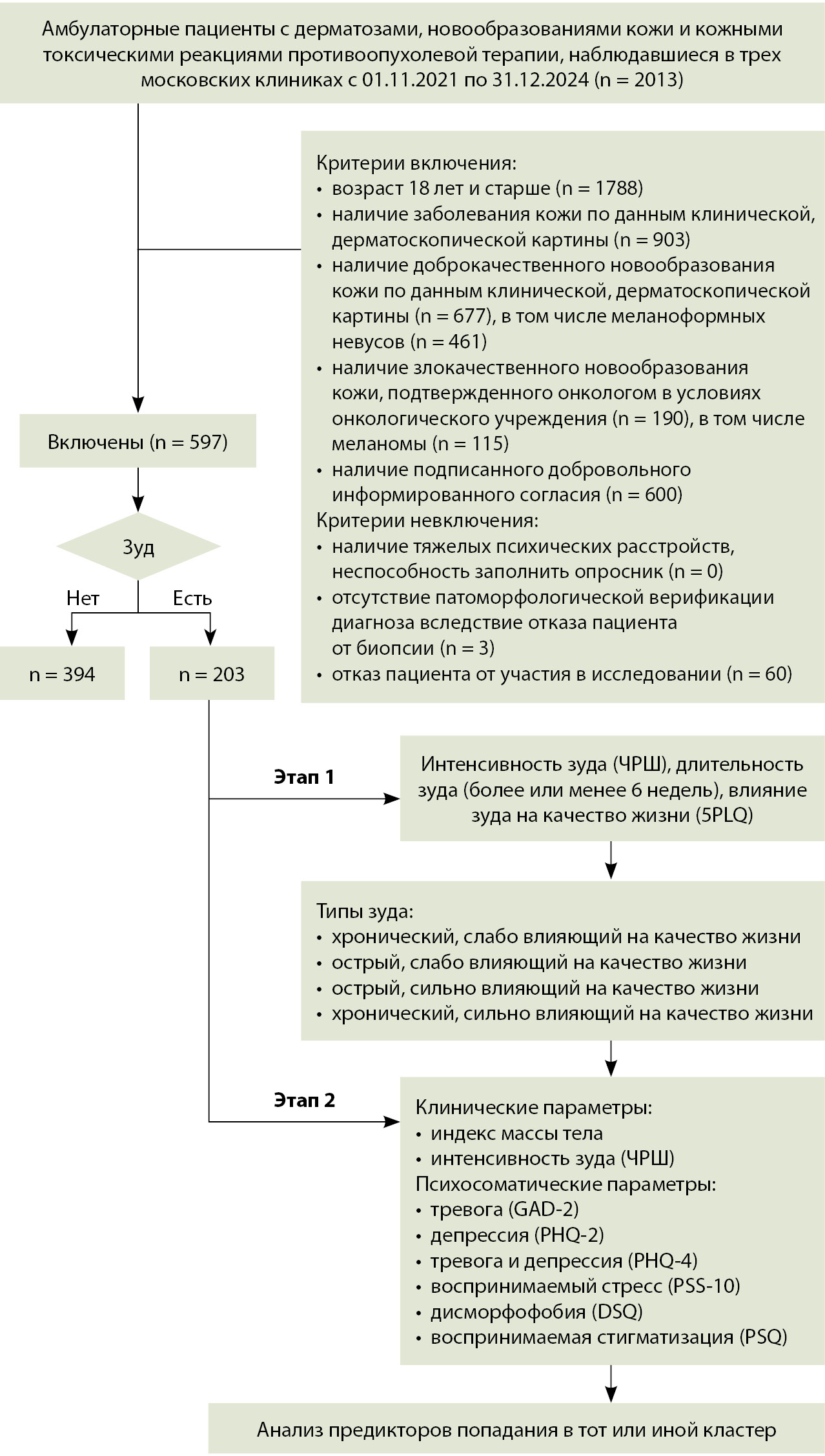 Для выявления естественного разбиения набора данных, описывающих зуд, обследованная выборка пациентов была разделена на предыдущем этапе [7] на кластеры, в соответствии с которыми были выделены четыре подгруппы зуда: хронический, слабо влияющий на качество жизни; острый, слабо влияющий на качество жизни; острый, сильно влияющий на качество жизни; хронический, сильно влияющий на качество жизни (этап 1, см. рис. 1). В настоящем исследовании (этап 2, см. рис. 1) проведена сравнительная характеристика пациентов с выделенными типами зуда по социодемографическим, соматическим (индекс массы тела) и психосоматическим параметрам (показатели уровня тревоги и депрессии по шкалам PHQ-4, PHQ-2, GAD-2; уровень стигматизации и дисморфофобии по шкалам PSQ и DCQ; доля пациентов с выявленными по шкалам тревогой, депрессией, дисморфофобией; уровень воспринимаемого стресса по шкале PSS-10). Далее оценены предикторы попадания в тот или иной кластер зуда.