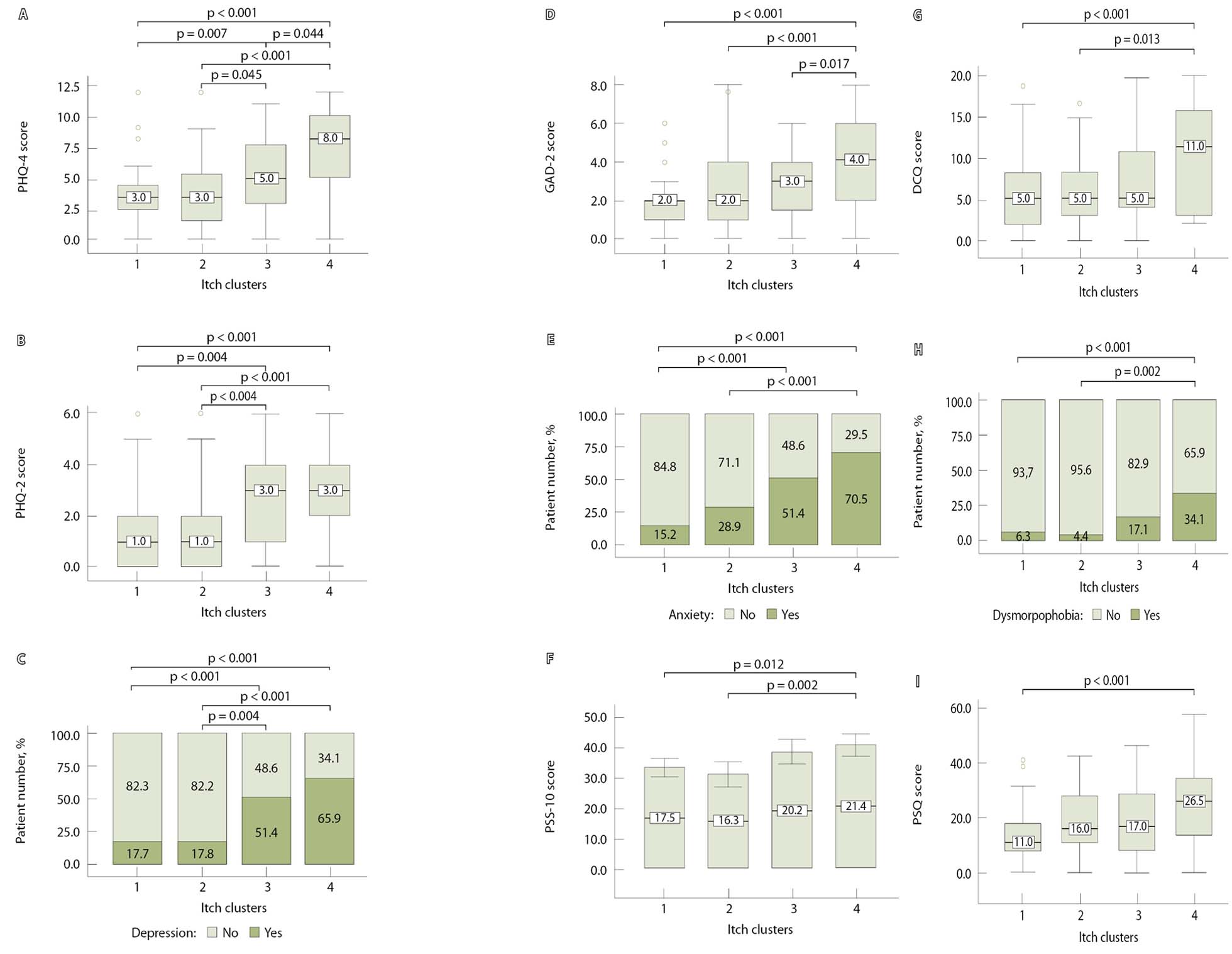 Выделенные на предыдущем этапе типы (кластеры) зуда в настоящей работе сравнивали по клиническим и психосоматическим параметрам: индекс массы тела, тревога (средний балл по шкале, выявленная тревога по шкале), депрессия (средний балл по шкале, выявленная депрессия по шкале), дисморфофобия (средний балл по шкале, выявленная дисморфофобия по шкале), уровень воспринимаемого стресса, стигматизация.