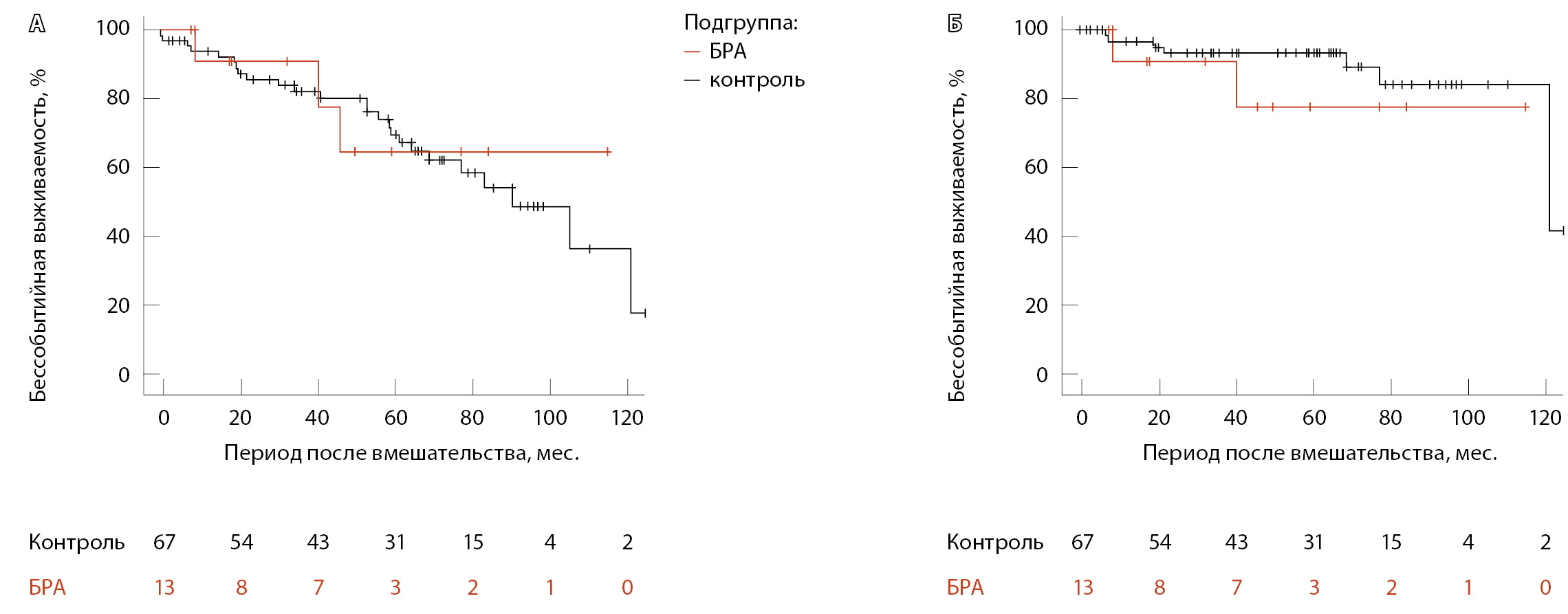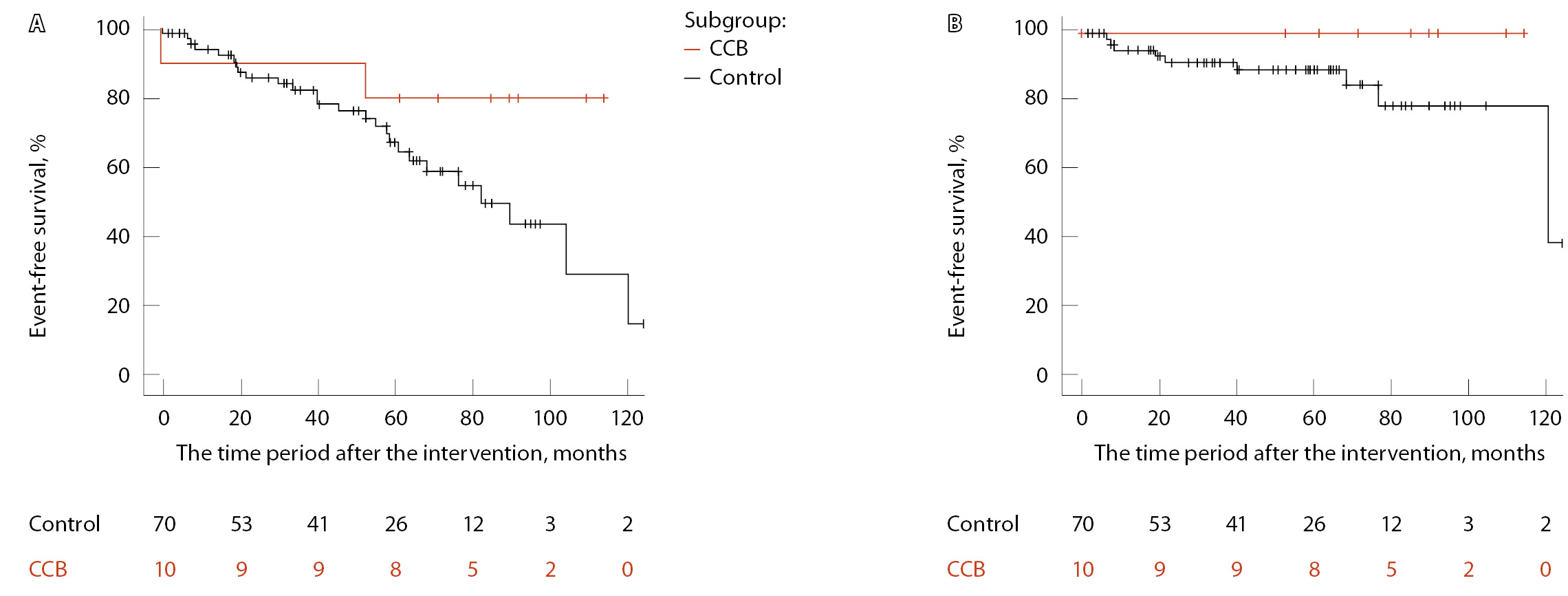Рис. 4. Бессобытийная выживаемость, оцененная методом Каплана – Мейера (А – неблагоприятные сердечно-сосудистые события (MACE), Б – госпитализация по поводу хронической сердечной недостаточности), в подгруппе пациентов, получавших блокаторы кальциевых каналов (БКК), в сравнении с контролем