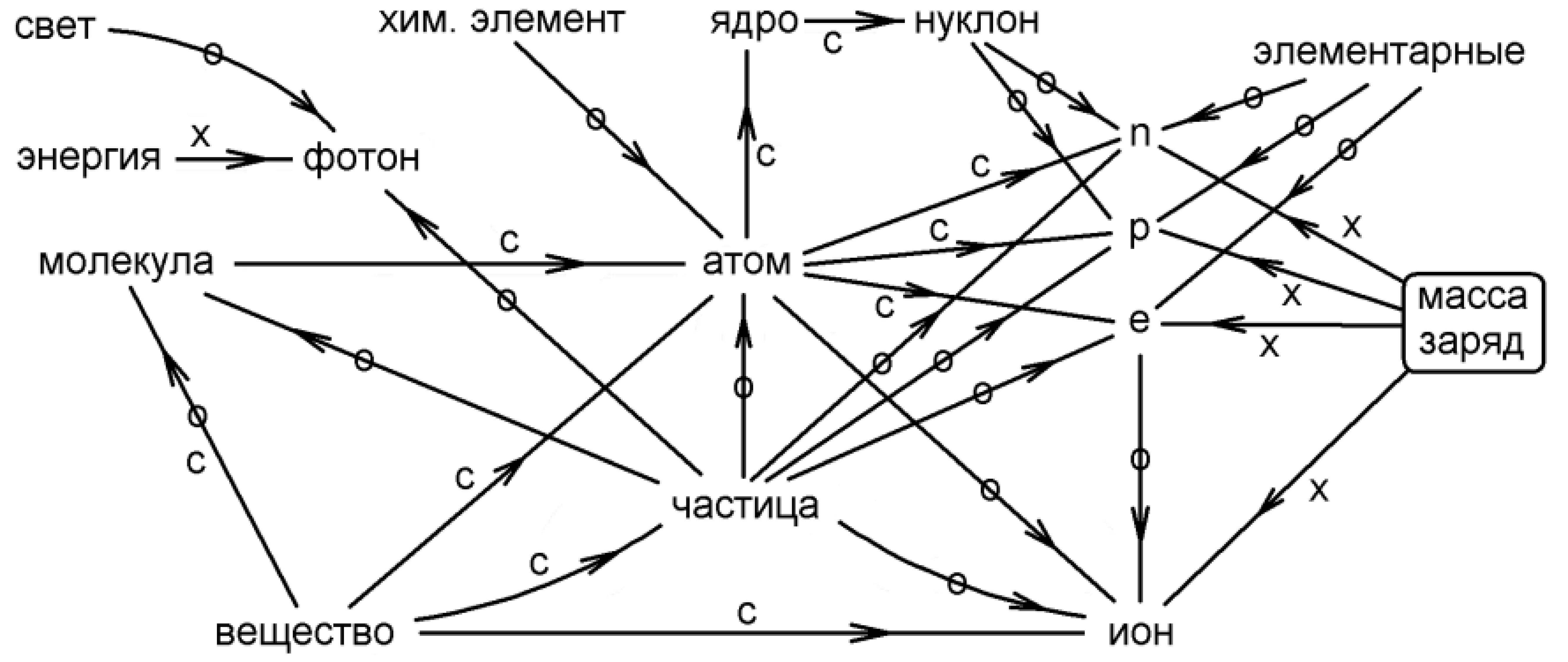 Перечисленные тексты используются в конце или после изучения школьного курса физики, когда у ученика (студента) уже сформированы первоначальные представления о микромире (то есть фоновые знания). Им соответствует семантическая сеть, представленная на рисунке 1, в которой реализуются связи трех типов: 1) связи, обозначающие предикаты «содержит» или «состоит» (молекула состоит из атомов, вещество состоит из частиц), изображенные стрелками с буквой «c»; 2) связи-определения («фотон – частица света» или «атом – мельчайшая частица химического элемента»), показанные стрелками с кружками; 3) связи, отвечающие предикату «характеризуется» (протон характеризуется зарядом 1,6 × 10-19 Кл и массой 1,67 × 10-27 кг), обозначенные стрелками с буквой «х». Эта сеть является упрощенной, в ней отсутствуют понятия «античастица», «антивещество», «позитрон» и не отражены факты типа: «атом может поглощать или излучать фотон» или «между нуклонами действуют ядерные силы» и т. д. В когнитивном пространстве успешного ученика представленные на рисунке 1 понятия тесно связаны друг с другом, расстояние между ними мало. При обучении новая информация «оседает» на фоновых знаниях, образуются новые узлы и связи.