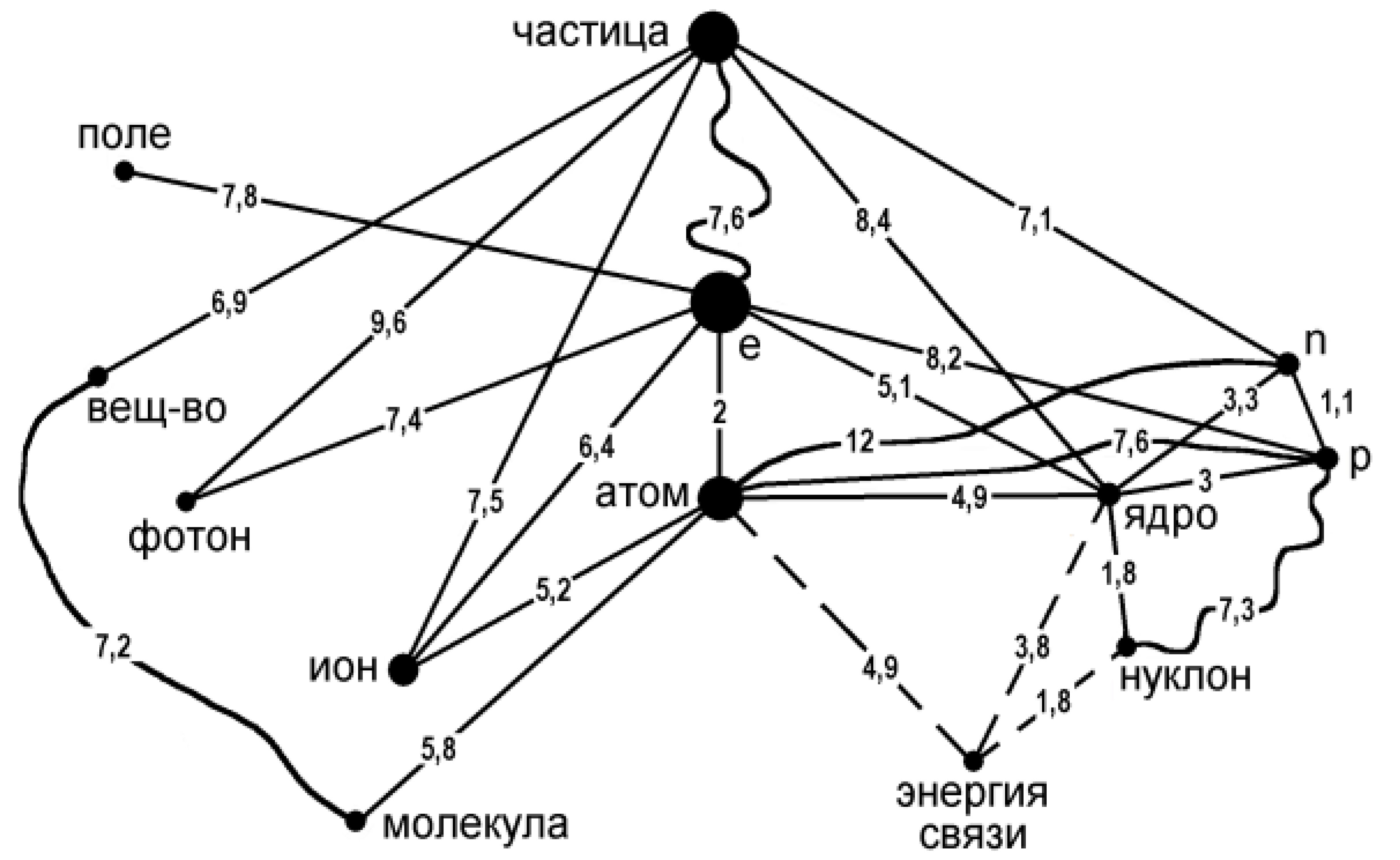 - Выбирают понятия (концепты), расстояние между которыми требуется найти: Вселенная, поле (гравитационное, электромагнитное и т. д.), вещество, частица, плазма, молекула, атом, ион, фотон, электрон, протон, нейтрон, нуклон, кварк, ядерные силы, энергия связи, ядро, термоядерная реакция.