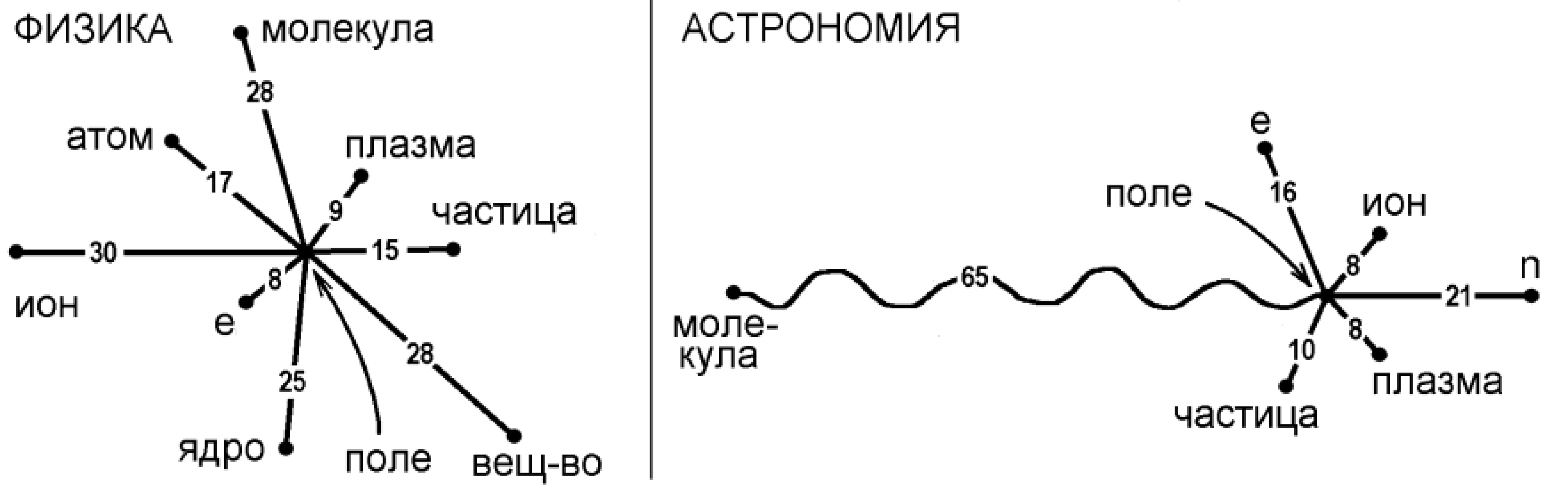 На рисунке 4 представлены графы, показывающие связи понятия «поле» (гравитационное, электромагнитное и т. д.) c другими близко расположенными к нему понятиями в физических и астрономических УТ. Видно, что множества ближайших понятий и семантические расстояния до них сильно отличаются, что объясняется особенностями учебного материала. В физических текстах концепт «поле» связано с понятием «электрон» и «плазма», а в астрономических – сильно связано с понятиями «ион», «плазма», «частица». Последнее можно записать так: поле (ион – 8; плазма – 8; частица – 10). Числа показывают расстояния L до понятия «поле». Другой пример, в физических УТ – атом (электрон – 2; ядро – 4,9; ион – 5,2; протон – 7,6), а в астрономических УТ – атом (молекула – 3,2; электрон – 4,7; частица – 4,9; вещество – 9,9; ион – 9,9).