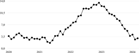 Рис. 1. Среднемировая продовольственная инфляция по сравнению с соответствующим месяцем предыдущего года, в %