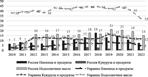 Так, например, цена на пшеницу с начала февраля до начала марта 2022 г. выросла в 1,74 раза (с 281 долл. за т до 490 долл. за т), а цены на зерновые в мире в среднем выросли примерно на 40% после начала вооруженного конфликта [7]. А поскольку Россия и Украина входят в число ведущих экспортеров основных зерновых продуктов, таких как пшеница, кукуруза и подсолнечное масло, то конфликт на Украине и последовавшие за этим скрытые санкции в отношении транспортировки российской продукции на рынки других стран и санкции в отношении российских банков не только осложнили логистику, но и создали прямые препятствия для вывоза продукции сельского хозяйства [8].