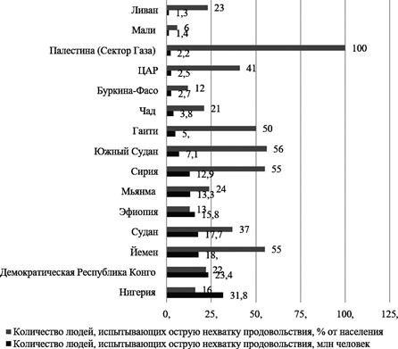 Рис. 3. Число людей, испытывающих острую нехватку продовольствия в странах, вовлеченных в конфликты
