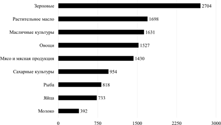 Источник: рассчитано авторами по: данные FAOSTAT 2024. Trade. Crops and livestock products. https://www.fao.org/faostat/en/#data/TCL (дата обращения: 04.09.2024).