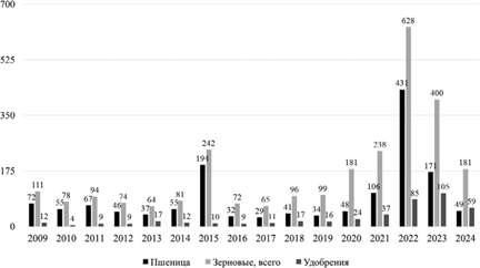 Рис. 5. Меры, ограничивающие торговлю зерновыми, пшеницей и удобрениями, введенные в период с 1 января 2009 г. по 27 октября 2024 г.