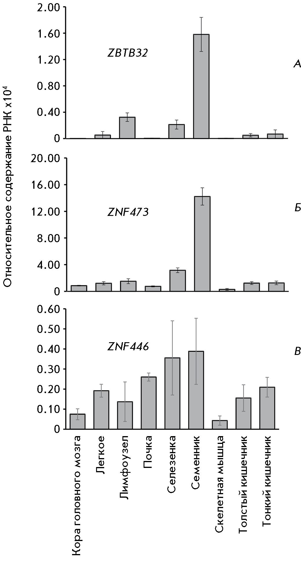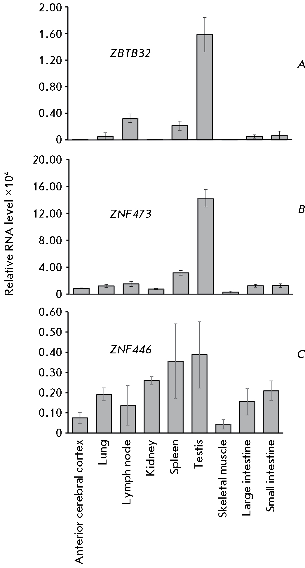 Fig. 2. Relative content of ZBTB32 (A), ZNF473 (B), and ZNF446 (C) transcripts in various tissues. The RNA level was normalized to the geometric mean levels of the housekeeping 18S rRNA and GAPDH gene transcripts