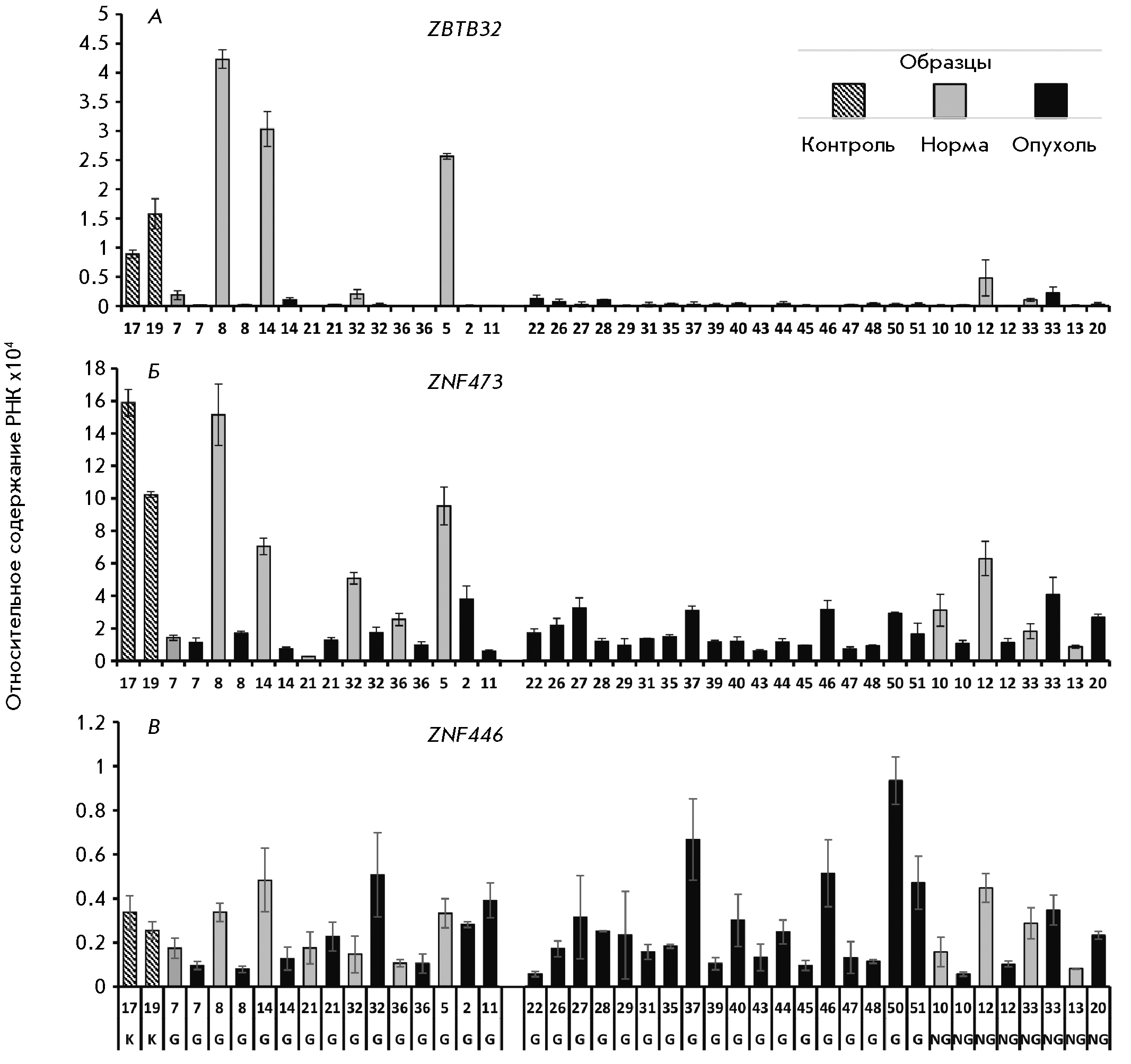 In general, a significant decrease in the ZNF473 and ZBTB32 transcription levels is observed in tumor as compared to healthy tissue (the Mann–Whitney p-value is <0.02 in both cases and >0.4 in ZNF446). These genes can act as markers for germ cell-derived tumors.