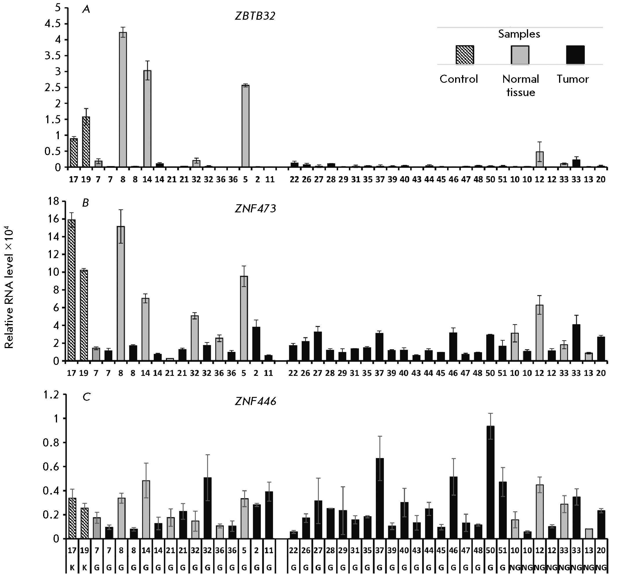Fig. 3. Relative levels of ZBTB32 (A), ZNF473 (B), and ZNF446 (C) transcripts in testicular tumor germ and non-germ cell samples. Control samples (healthy testicular parenchyma) are indicated by the dashed line, samples from healthy tissue adjacent to the tumor are highlighted in gray, and tumor tissue samples are marked in black. Healthy and tumor tissue samples sharing the same number belong to the same patient. The letters at the bottom stand for: K – control samples; G – germ cell tumor samples; NG – tumor samples that do not contain germ cells. The RNA level was normalized to the geometric mean levels of 18S rRNA and GAPDH