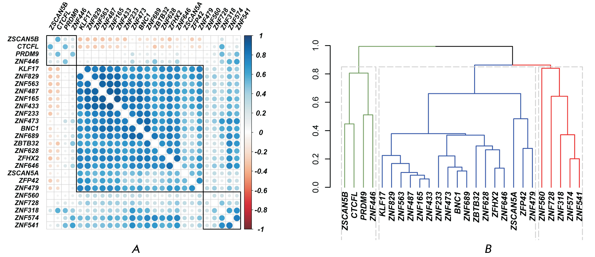 Fig. 4. Correlation matrix of the transcription levels of 25 genes selected based on their testis-specific expression and the control gene ZNF446 in 361 testis samples from the GTEx collection (A). The genes are arranged according to hierarchical clustering using the complete linkage method. Cluster boundaries are outlined in black. Spearman’s correlation coefficients are presented; their values are indicated by color. Dendrogram shows the consistency of gene expression (B). As a measure of the difference, a value equal to 1 - the Spearman correlation coefficient modulus was used. Three clusters are outlined; they are indicated by different colors; the dotted gray line indicates cluster boundaries