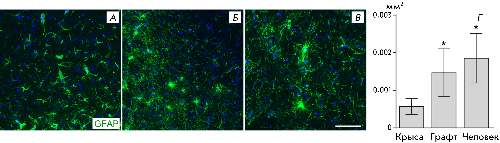 This study has shown that the morphological features and distribution of transplanted astrocytes reflect their complex interactions with host cells and transplanted neurons. In addition to the migration and integration of transplanted astrocytes to brain structures, transplantation is accompanied by glial shaft formation and reactive changes in astroglia. The distribution features of xenografted astrocytes should be considered upon planning experiments, and control of the glial component is required in assessing the graft condition.
