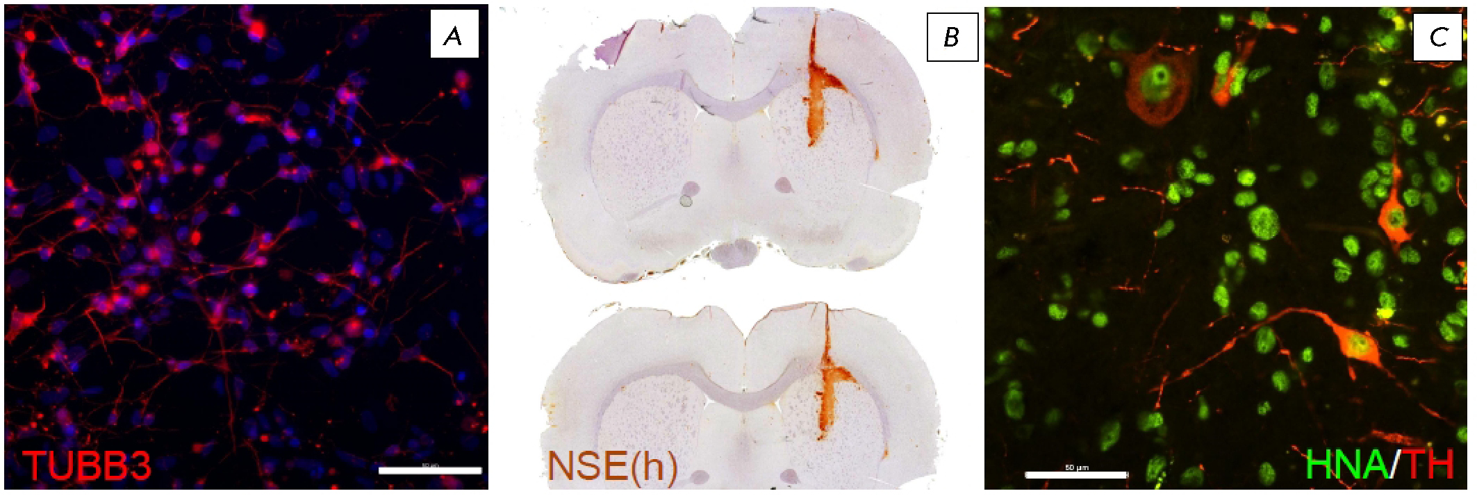 Fig. 1. Neural markers in the IPSC culture and in the graft. (A) Beta-3-tubilin in culture (TUBB3, red). (B) Human neuron-specific enolase (NSE) in the graft area (immunoperoxidase staining). (C) Human tyrosine hydroxylase-positive neurons in the graft (HNA, green; TH, red). Scale bar: (A), (C), 50 μm