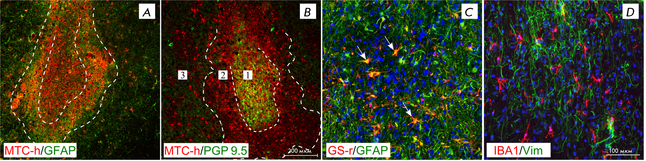 Fig. 2. Glial-neural organization of the graft 6 months after transplantation. (A) Human cell graft area in the striatum; GFAP staining (green) and MTC-h staining (red). (B) Human cell graft area in the striatum, PGP 9.5 staining (green) and MTC-h staining (red). (C) Human (green, GFAP) and rat (orange, GFAP/GS-positive cells, indicated by arrows) astrocytes in the graft area. (D) Vimentin-positive astrocytes (green) and microglia (red) in the graft area. The boundaries of the selected areas in (A) and (B) are denoted with a dashed line: 1 – central area; 2 – glial scar area; 3 – lateral area. Scale bar: (A), (B), 200 μm; (C), (D), 100 μm