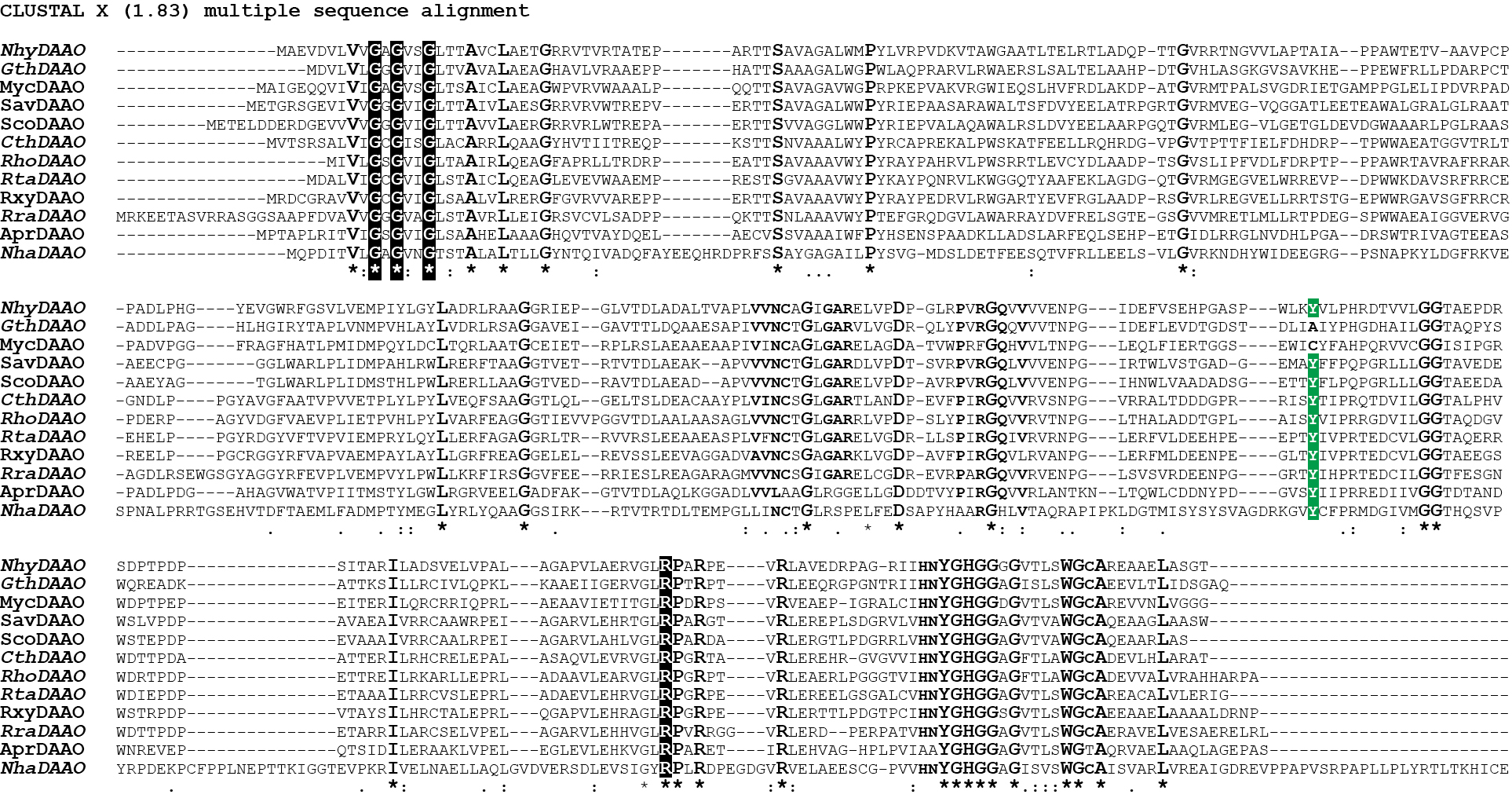Fig. 1. Alignment of the amino acid sequences of D-amino acid oxidases from yeast, bacteria and archaea (the names are shown in blue and black, respectively). See Table 1 for the name correspondence. Novel DAAO sequences from bacteria analysed in this work are shown in bold italics. Letters on a green background in the alignment refer to residues that were previously considered as conserved for D-amino acid binding in the DAAO active site