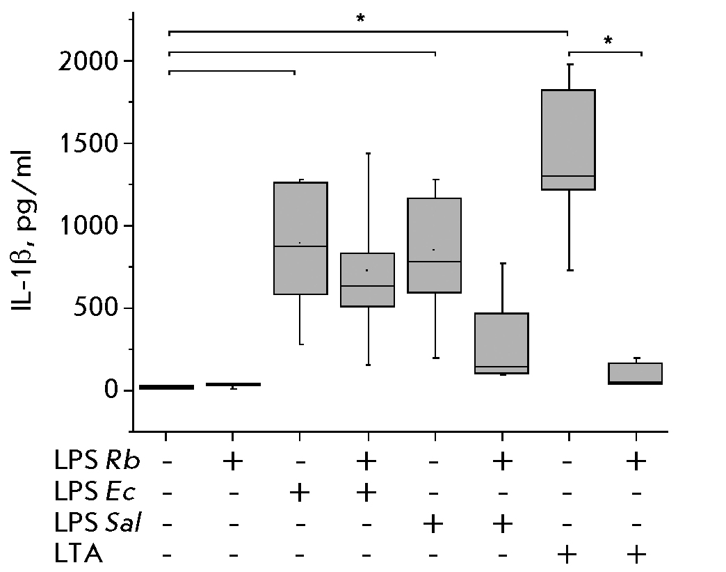 Fig. 3. Effect of R. capsulatus PG LPS on IL-1β secretion upon activation of blood cells by E. coli LPS, S. enterica LPS, or S. piogenes LTA, n = 7. *p < 0.05