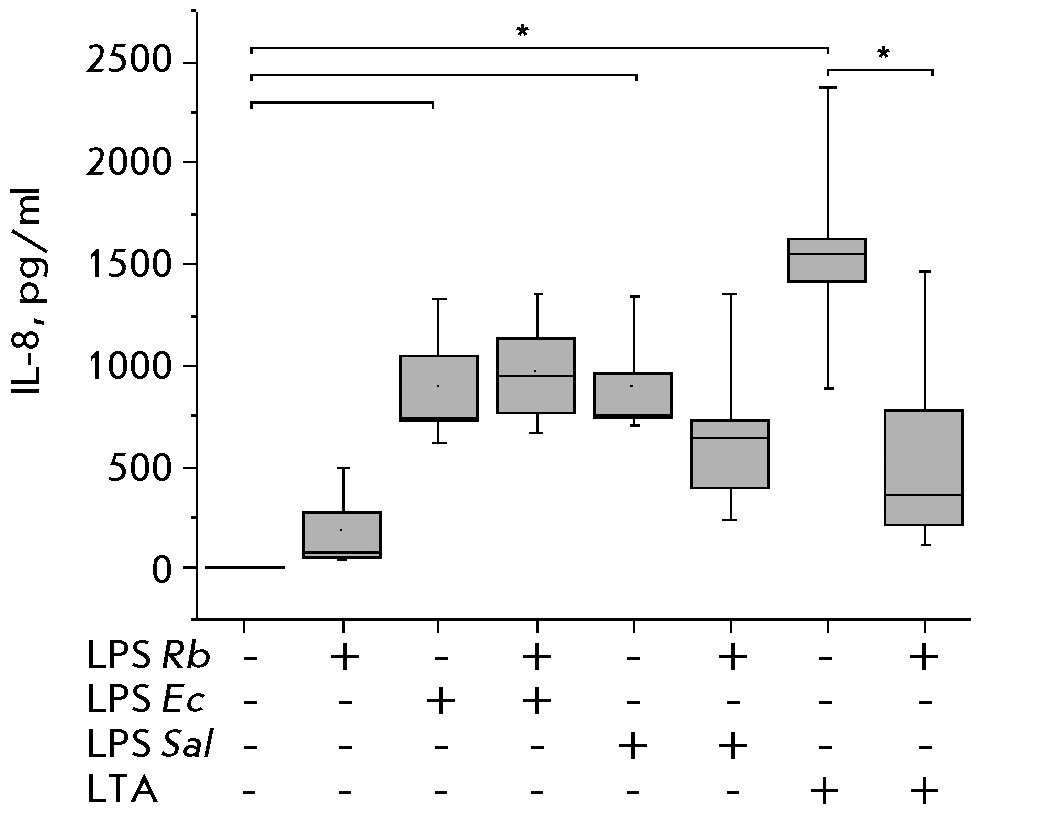 Fig. 4. Effect of R. capsulatus PG LPS on IL-8 secretion upon activation of blood cells by E. coli LPS, S. enterica LPS, or S. piogenes LTA, n = 7. *р < 0.05