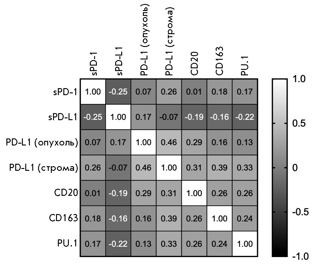 The analysis showed that the plasma content of the soluble form of the sPD-1 receptor inversely correlates with the plasma content of sPD-L1 and directly correlates with the tissue expression of PD-L1 in stromal cells (r = -0.251; p = 0.047 and r = 0.255; p = 0.044, respectively). Also, PD-L1 expression in the stromal cells of gastric tumors directly correlates with PD-L1 expression in tumor cells and the content of all stromal markers examined. A similar pattern was observed for B cells: namely, the content of CD20+ cells in tumor stroma positively correlates with both macrophage content and PD-L1 expression in both stroma and tumor cells, and this correlation was statistically significant.