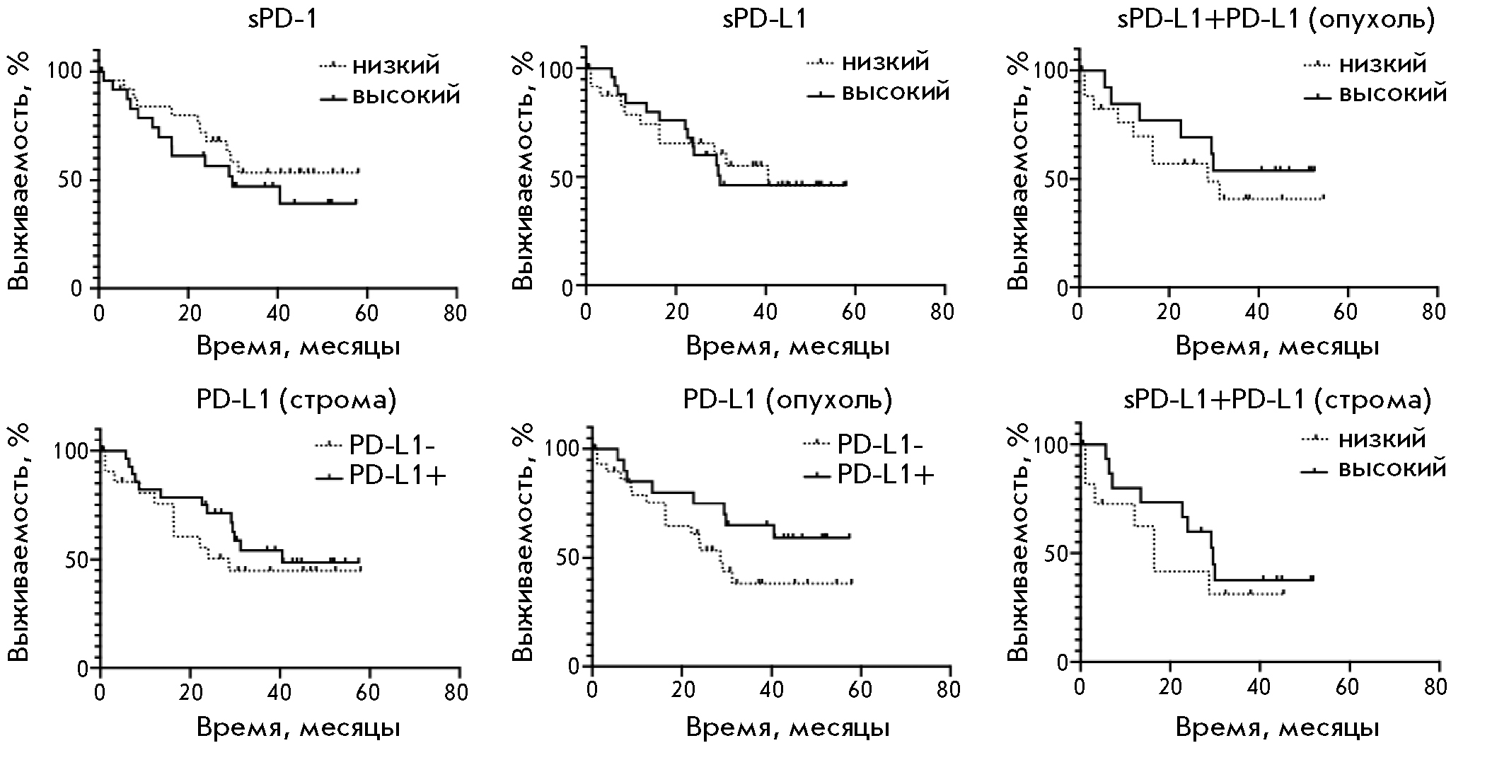 Fig. 4. Analysis of the overall survival of GC patients depending on the content of soluble (sPD-L1, sPD-1) and tissue (PD-L1, PD-1) forms of the main components of the PD-1/PD-L1 immunity checkpoint