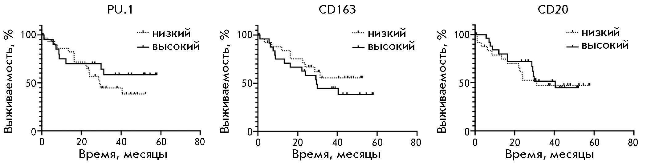 The data in Fig. 4 show that the studied stromal markers (PU.1, CD163, and CD20) are not prognostically significant in GC.