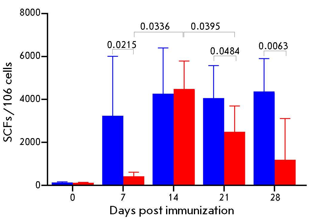 No difference in the dynamics of developing humoral immunity in mice in response to inoculation of VACV LIVP by intradermal injection or skin scarification was revealed