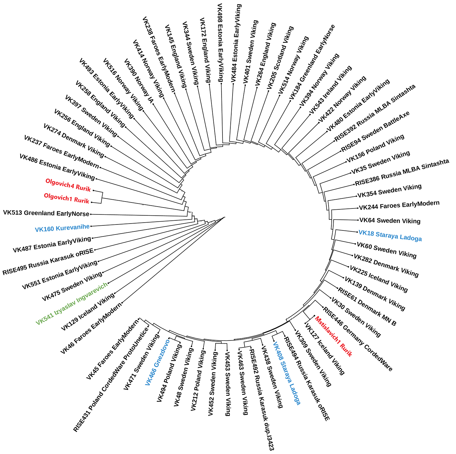 Fig. 2. Phylogenetic tree of the Y chromosome, reflecting the relationship between the alleged modern Rurikids (marked in red) and samples from the database “The Allen Ancient DNA Resource,” belonging to the haplogroup R1a. The green color marks the sample of the alleged Prince Izyaslav Ingvarevich Lutsky, the blue color marks the samples of “Vikings” from the territory of modern Russia