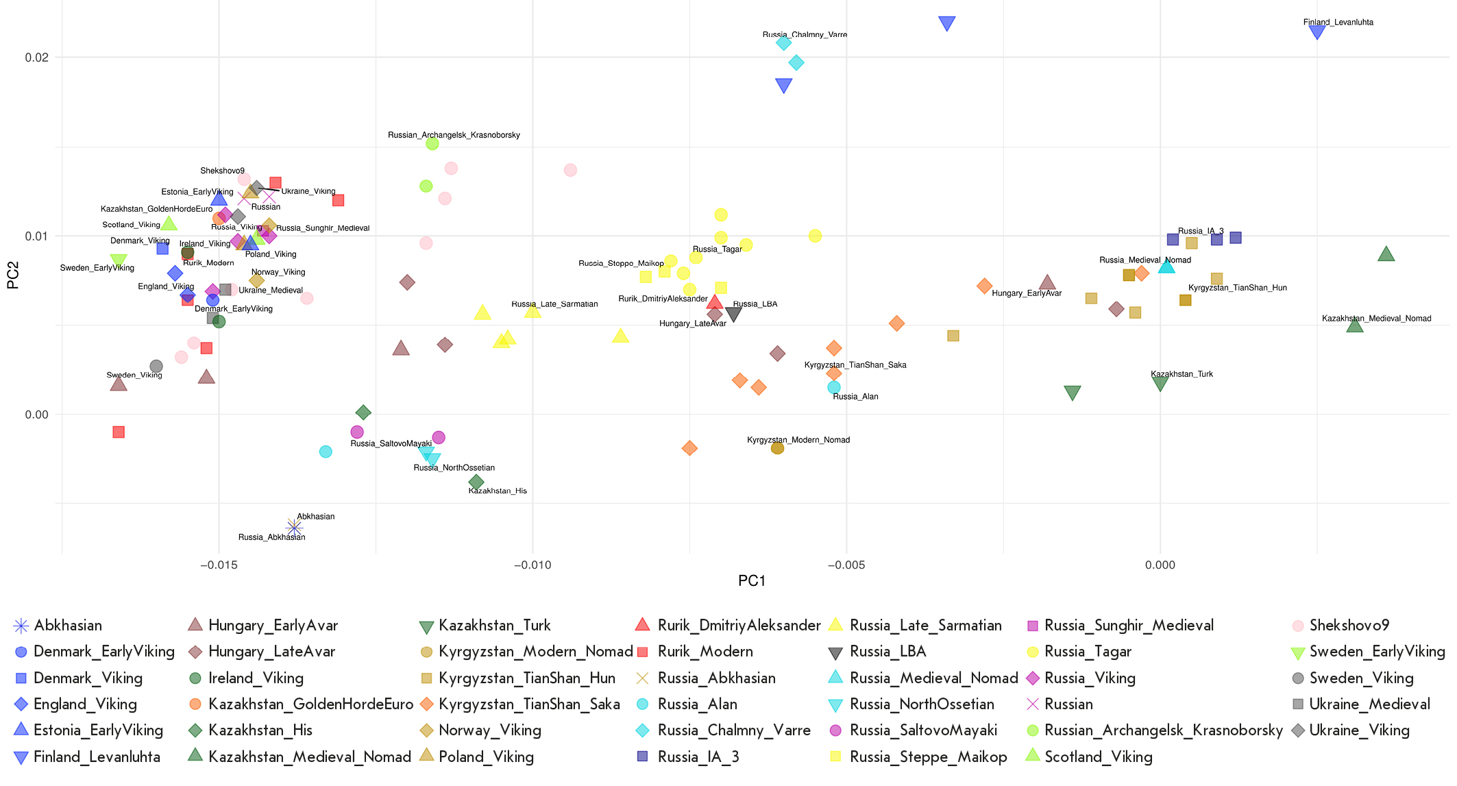 Fig. 4. Principal component analysis. The genome of Prince Dmitry Alexandrovich was projected onto the ancient and modern populations of Eurasia
