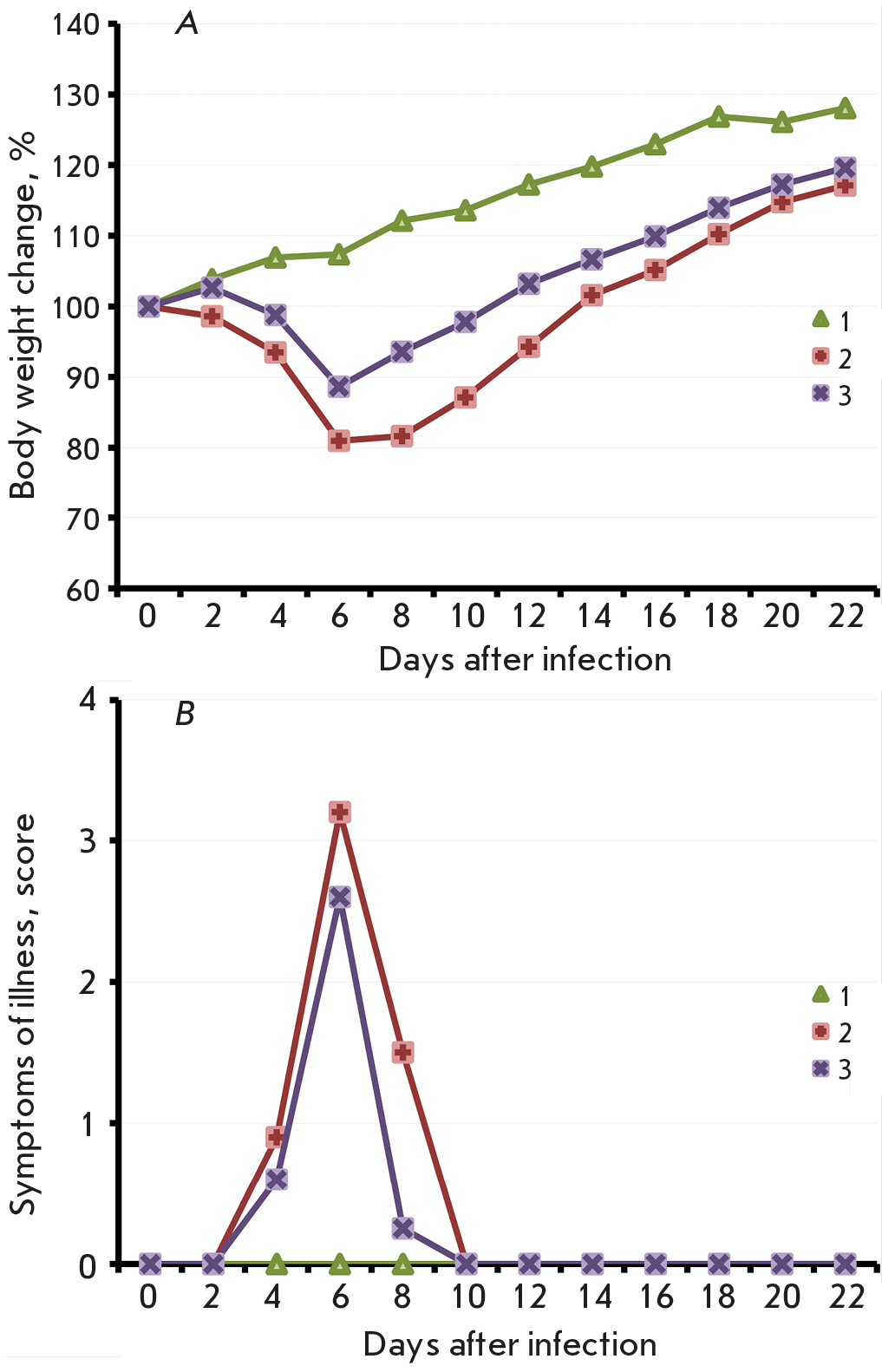 Fig. 3. The dynamics of changes in mouse body weight (A) and clinical manifestations of the infection (B) after i.n. inoculation of the LIVP (2) or LIVPΔati (3) viruses at a dose of 107 pfu. Data for groups consisting of 10 animals infected with the respective viruses, as well as the control group (1), are presented