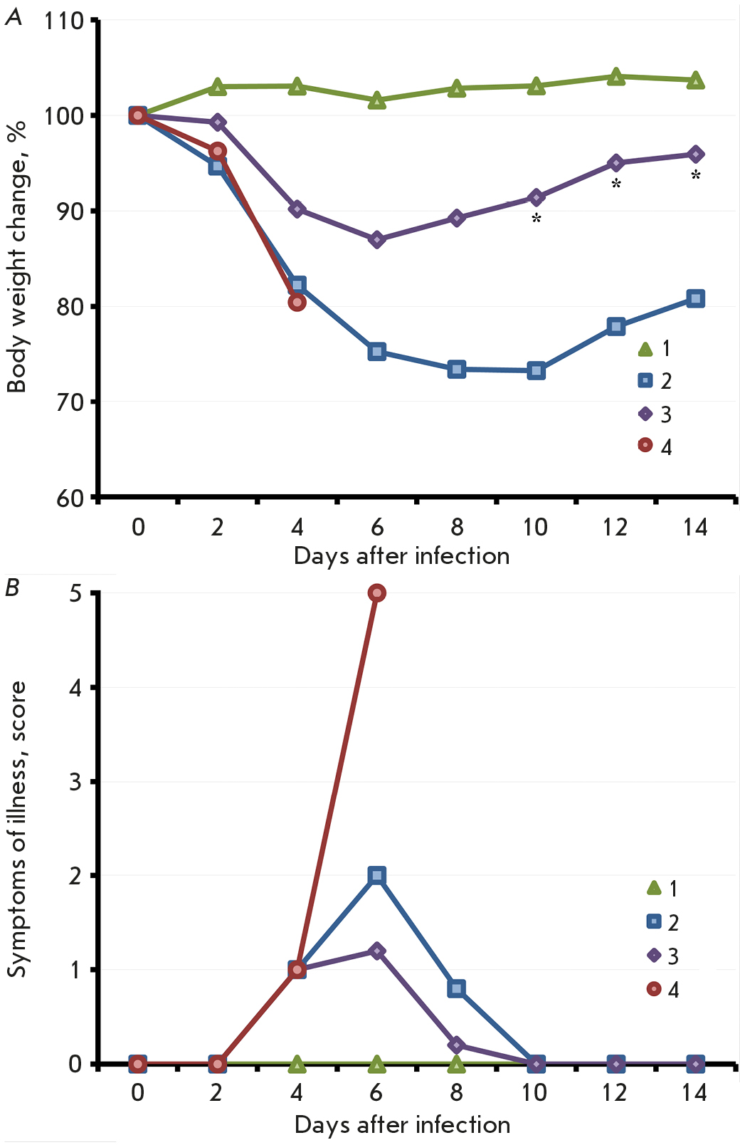 Fig. 7. The dynamics of changes in body weight (A) and clinical manifestations of the infection (B) after i.n. infection of mice vaccinated with LIVP (2) or LIVP∆ati (3) with CPXV-GRI on day 60 post-immunization. The data are presented for groups consisting of six animals. The controls were groups of non-vaccinated mice, both non-infected (1) and infected with CPXV-GRI (4). An asterisk shows the time points at which the mean body weights (expressed as a percentage of the initial weight) in the group of mice immunized with LIVP∆ati differ statistically significantly from those in the group of mice immunized with LIVP. Comparison was performed using the Student’s t-test for independent samples