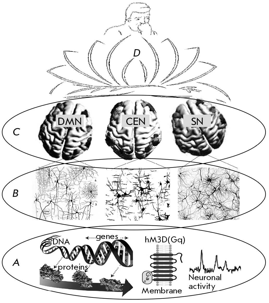 Рис. 1. Схема многоуровневой организации функций головного мозга млекопитающих. A – молекулярно-клеточные процессы, включающие гены, белки, мембрану клетки со встроенными в нее белками (в качестве одного из мембранных белков представлена схема хемогенетического рецептора активирующего типа hM3D(Gq)), а также электрофизиологическая активность нейрона. Б – нейронно-сетевые процессы, являющиеся основой структурно-функциональной организации мозга, осуществляют ансамбли взаимосвязанных контактами нейронов. В – процессы в крупномасштабных сетях головного мозга, каждая из которых формировалась в ходе эволюции на основе нейронных ансамблей, схемы которых представлены в части (Б), для преимущественного выполнения каждой из них определенных адаптивных функций. На схемах апикальной поверхности мозга человека представлены три крупномасштабные сети: сеть пассивного режима работы головного мозга (Default Mode Network, DMN), центральная исполнительная сеть (Central Executive Network, CEN) и сеть ситуативной значимости (Salience Network, SN). Наиболее важные участки каждой из сетей затемнены. По-видимому, взаимодействия DMN, CEN, SN, а также ряда других крупномасштабных сетей головного мозга обеспечивают когнитивные и поведенческие проявления у человека (Г)