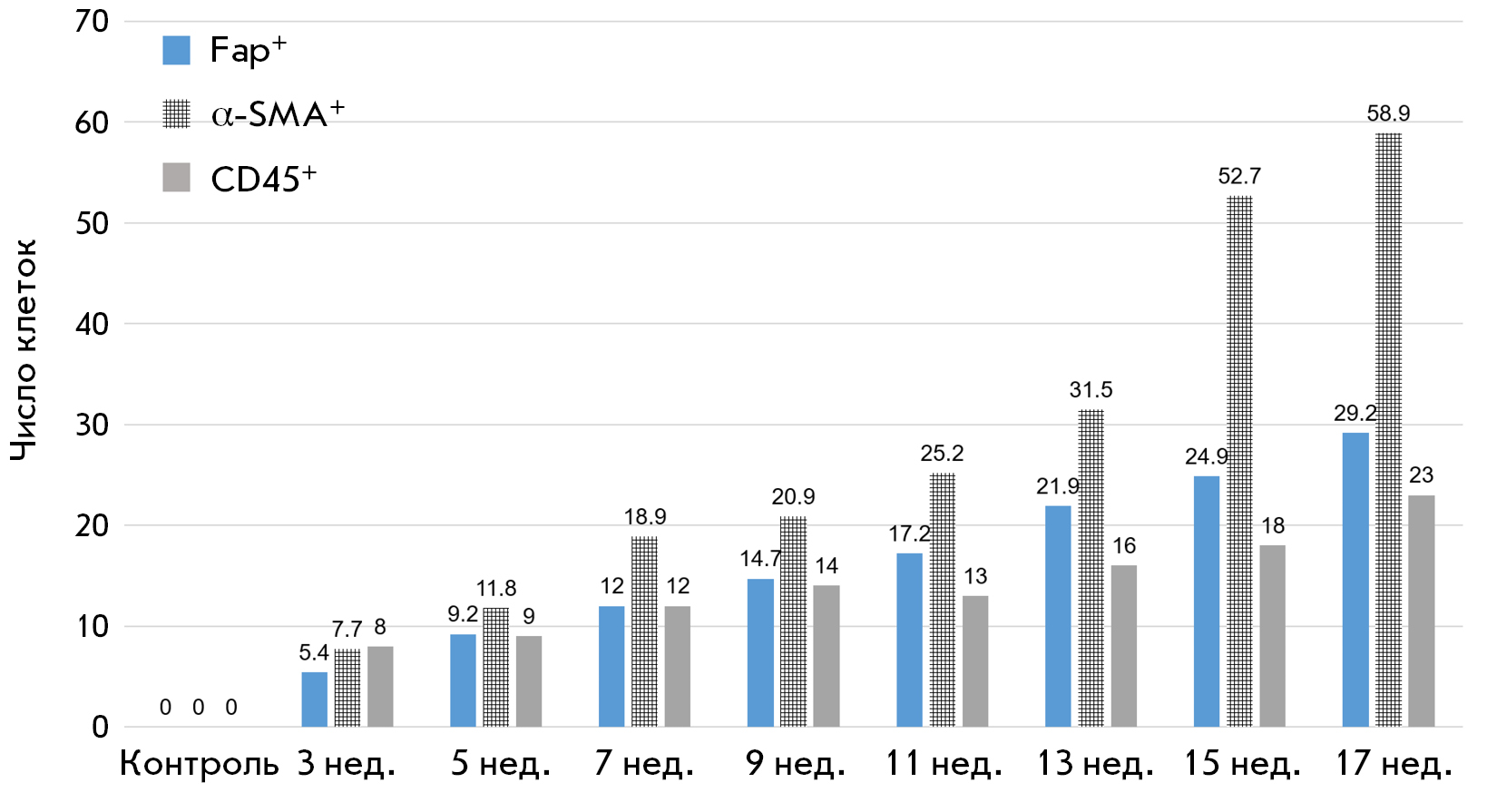 Начиная с 3 нед., наблюдали рост количества всех клеток, несущих указанные маркеры, однако число α-SMA+-, CD45+-клеток превышало число FAP+-клеток (рис. 4).