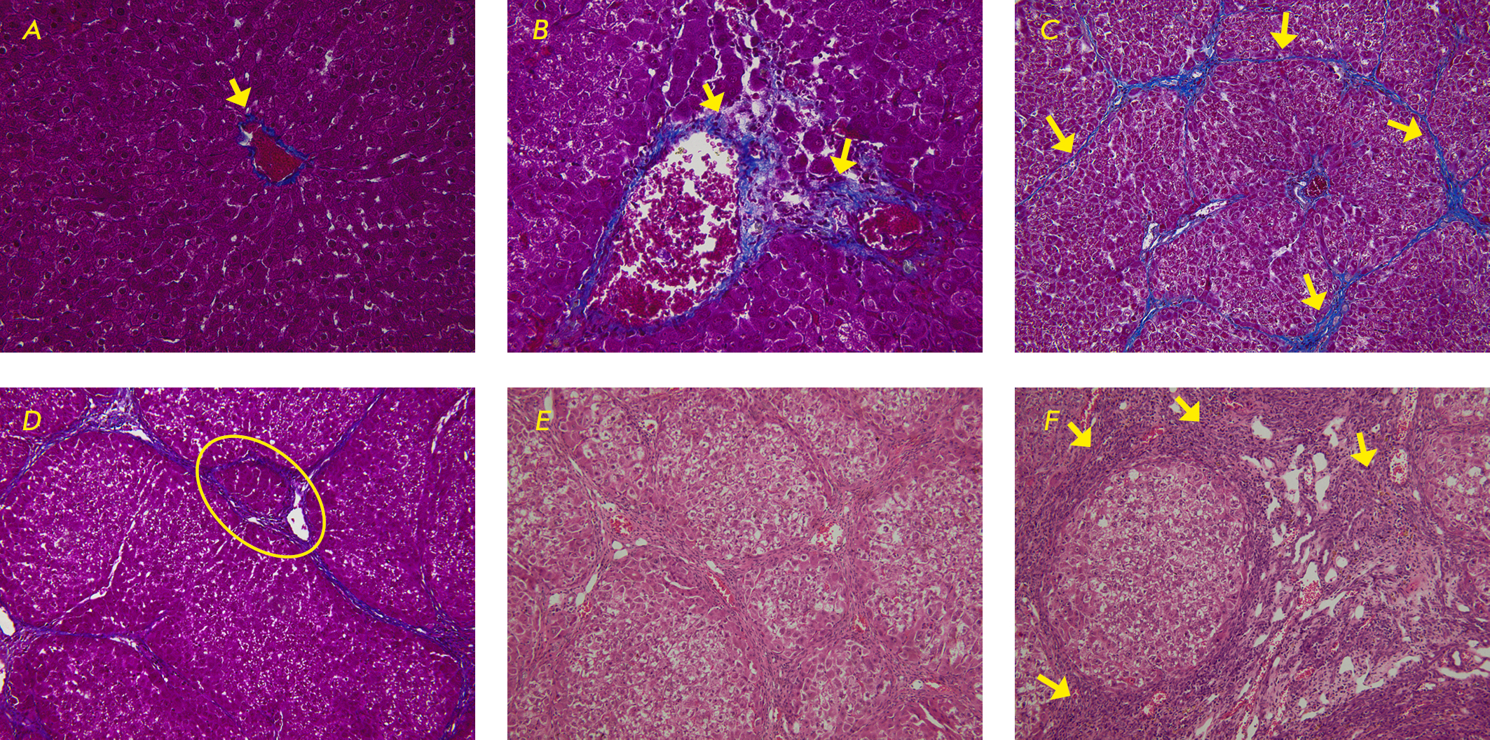 У животных интактной группы выявили незначительное количество соединительной ткани вокруг междольковых сосудов и желчных протоков портальных зон, центральных и собирательных вен (F0, рис. 1А).