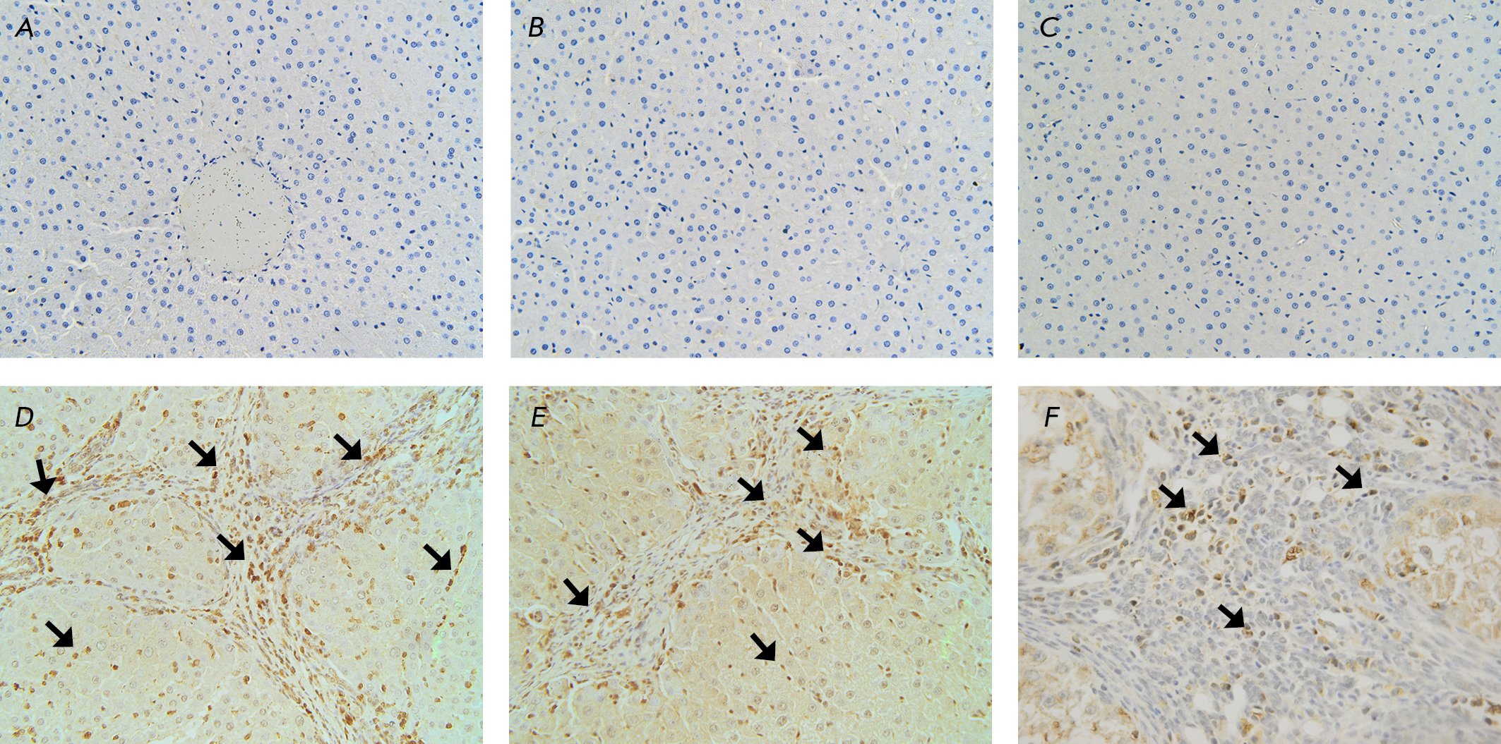 Иммуногистохимическое исследование проводили на парафиновых срезах [20]. В качестве маркера активированных PF применяли поликлональные антитела кролика FAP (FAP-alpha, пролилэндопептидаза FAP, разведение 1 : 100), активированных HSC – моноклональные антитела мыши к α-SMA (alpha-SMA, АСТА2, разведение 1 : 1000), гемопоэтических стволовых клеток – поликлональные антитела кролика (CD45, разведение 1 : 200). Антитела производства Wuman Elabscience Biotechnology Incorporated Company, каталожный номер Е-АВ-32870 (FAP), Е-АВ-22155 (α-SMA), Е-АВ-16319 (CD45). В работе также использовали набор 2-step plus Poly-HRP Anti Rabbit/Mouse IgG Detection System/with DAB Solution; Retrieve-All Antigen (Unmasking System Basic), буфер для разведения антител (BioLegend), Твин-20 (Glentham Life Sciences), PBS (Melford). Для лучшей ориентации в препарате и правильной идентификации клеток, содержащих искомый антиген, срезы докрашивали гематоксилином Майера в течение 1 мин. Для объективной интерпретации результатов каждой исследуемой серии (группы животных) использовали положительный и отрицательный контроли. Иммуногистохимическую окраску оценивали как положительную только при отсутствии окрашивания в отрицательном контроле и, наоборот, как отрицательную при окрашивании в положительном контроле.