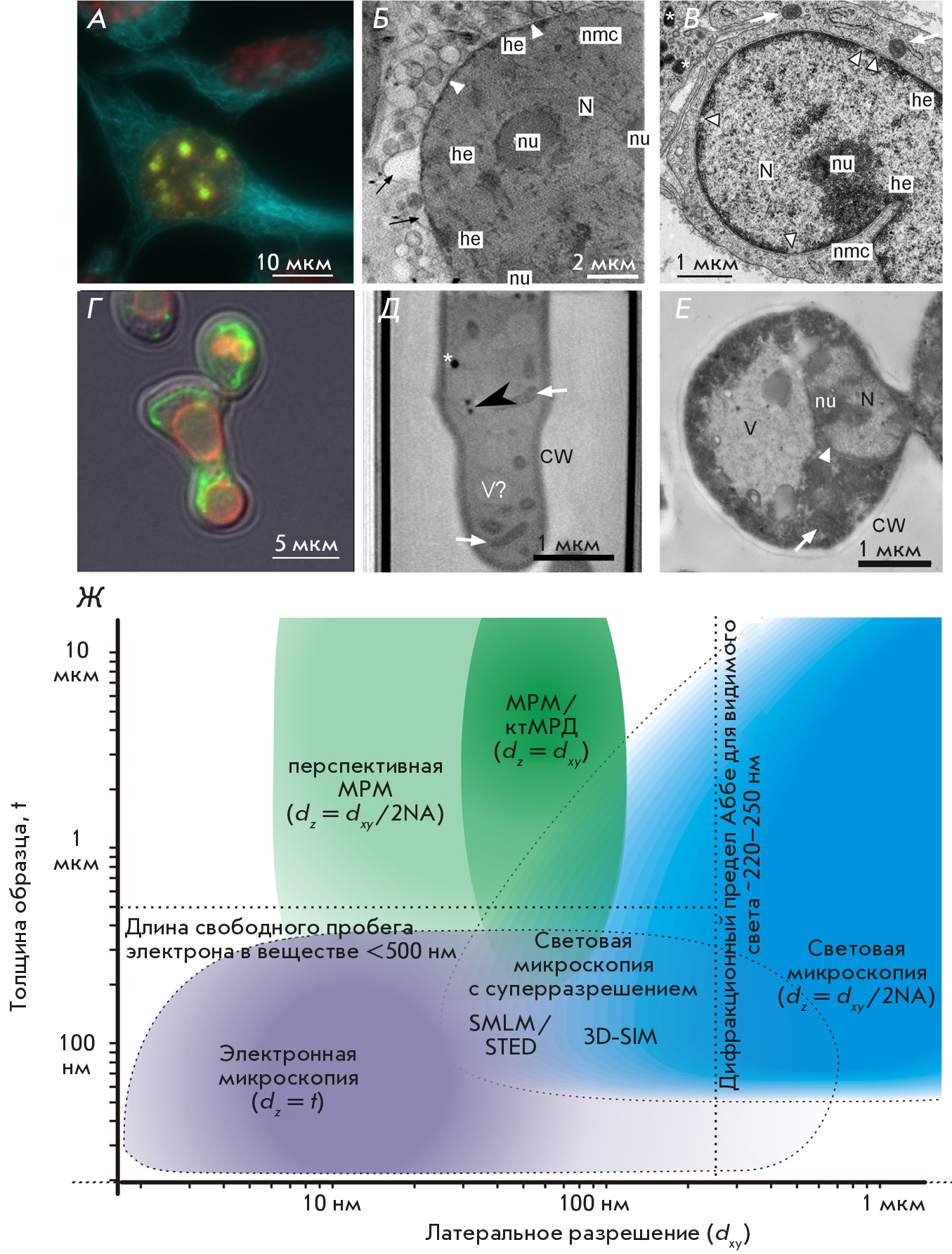 А–В – клетки млекопитающих (фибробласты мыши). А – широкопольная флуоресцентная микроскопия, фиксированные клетки in vitro: голубой – микротрубочки, флуоресцентно меченные антитела против альфа-тубулина; зеленый – новореплицированная ДНК, click-реакция с этинилдезоксиуридином; красный – ядра, ДНК-связывающий флуорохром DAPI. Б – виртуальный срез криофиксированной клетки, ктМРД: N – ядро, nu – ядрышки; he – гетерохроматин, nmc – впячивание ядерной оболочки внутрь ядра (nuclear membrane channel), указатель – ядерная оболочка, черные стрелки – выпячивания внешней мембраны ядерной оболочки (адаптировано с модификациями из [11] CC 4.0 BY). В – электронная микрофотография ультратонкого среза клетки, фиксированной альдегидами и контрастированной тяжелыми металлами: стрелка – митохондрия; * – липидные капли. Г–Е – дрожжи S. cerevisiae. Г – живая клетка (зигота), целиком широкопольная флуоресцентная микроскопия: зеленый – митохондрии, химерный митохондриальный белок Idh1-GFP; красный – мембрана вакуоли, флуорохром FM4-64; контуры клетки – дифференциальный интерференционный контраст (фотография любезно предоставлена Кнорре Д.А.). Д – виртуальный срез криофиксированной клетки, полученный методом ктМРД: V – вакуоль; CW – клеточная стенка; черный указатель – структура, использованная для корреляции, возможно, мелкая липидная капля (адаптировано c модификациями из [15], CC0 1.0). Е – электронная микрофотография ультратонкого среза клетки, фиксированной альдегидами и контрастированной тяжелыми металлами. Расположение МРМ, световой и электронной микроскопии в «пространстве разрешающей способности» (Ж). Интенсивность цвета соответствует тем масштабам, на которых метод наиболее востребован в исследовании структур и функционирования клетки. NA – числовая апертура, геометрическое описание светособирающей способности объектива в сочетании с длиной волны излучения (λ) является главным фактором, определяющим предельное разрешение объектива: dxy = 0.61 × λ/NA [4]. Фотографии А, В, Е сделаны авторами обзора