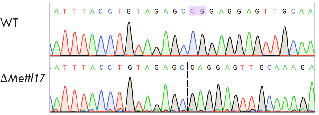 The Mettl17 mutation leading to gene inactivation was verified by Sanger sequencing of the amplified fragments.