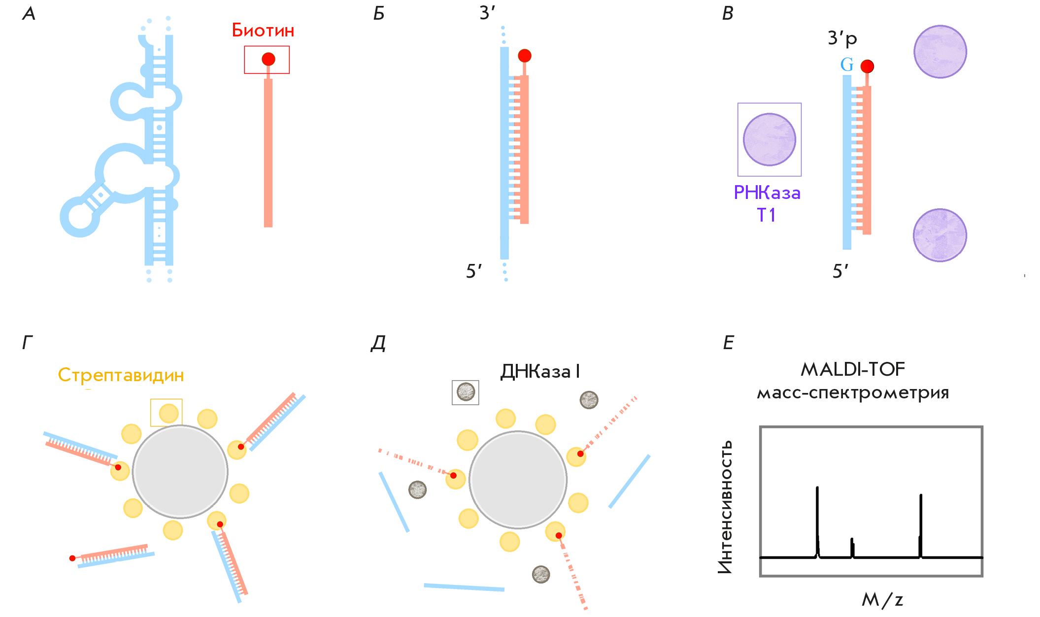 Fig. 4. Diagram for isolating RNA fragments using biotinylated oligonucleotides. (A) – a 12S rRNA region (blue) and a biotinylated oligonucleotide (coral, biotin – red). (B) – after annealing, the secondary structure of rRNA melts, and the rRNA region hybridizes with the oligonucleotide. (C) – after treatment with RNase T1, a DNA–RNA duplex remains; RNase T1 cuts ssRNA after guanylic acid residues, leaving a 3’-phosphate. (D) – DNA–RNA duplexes bind to magnetic beads through biotin–streptavidin interactions. (E) – after treatment with DNase I, DNA is destroyed and RNA occurs in solution. (F) – analysis of isolated RNA fragments using MALDI-TOF mass spectrometry