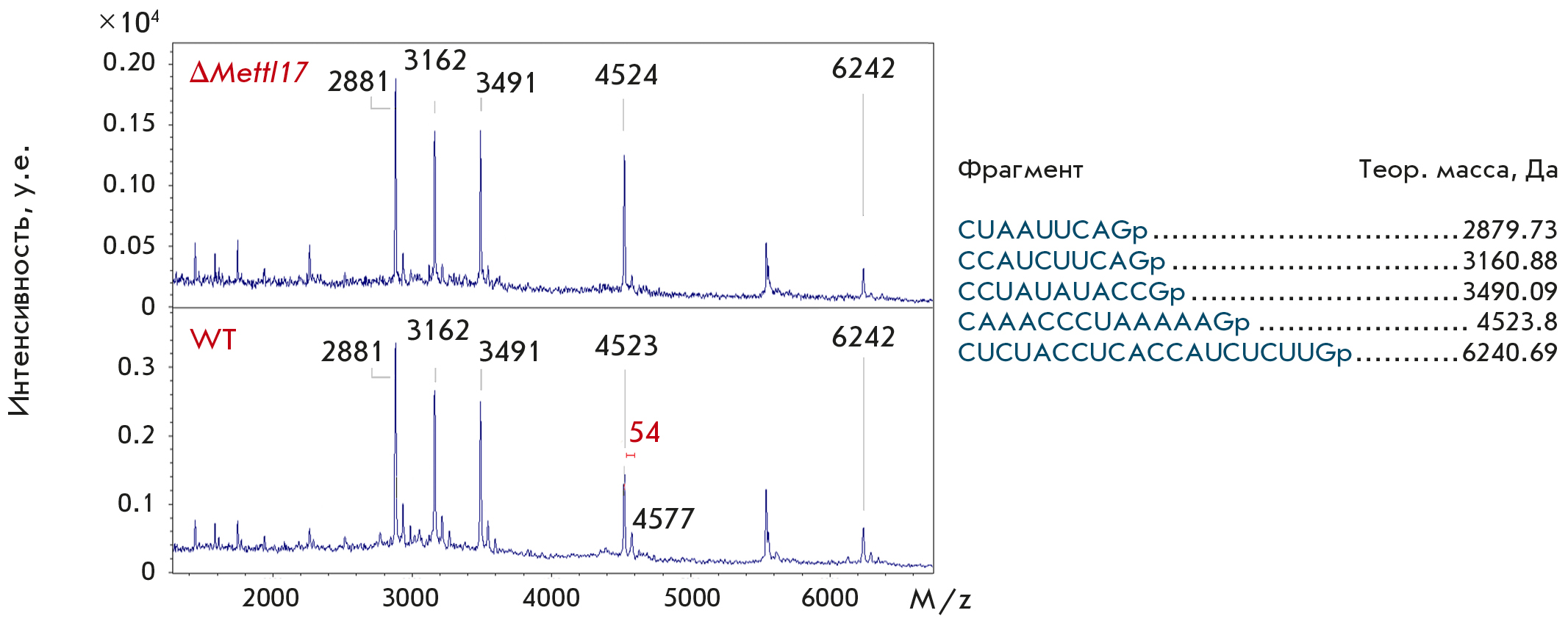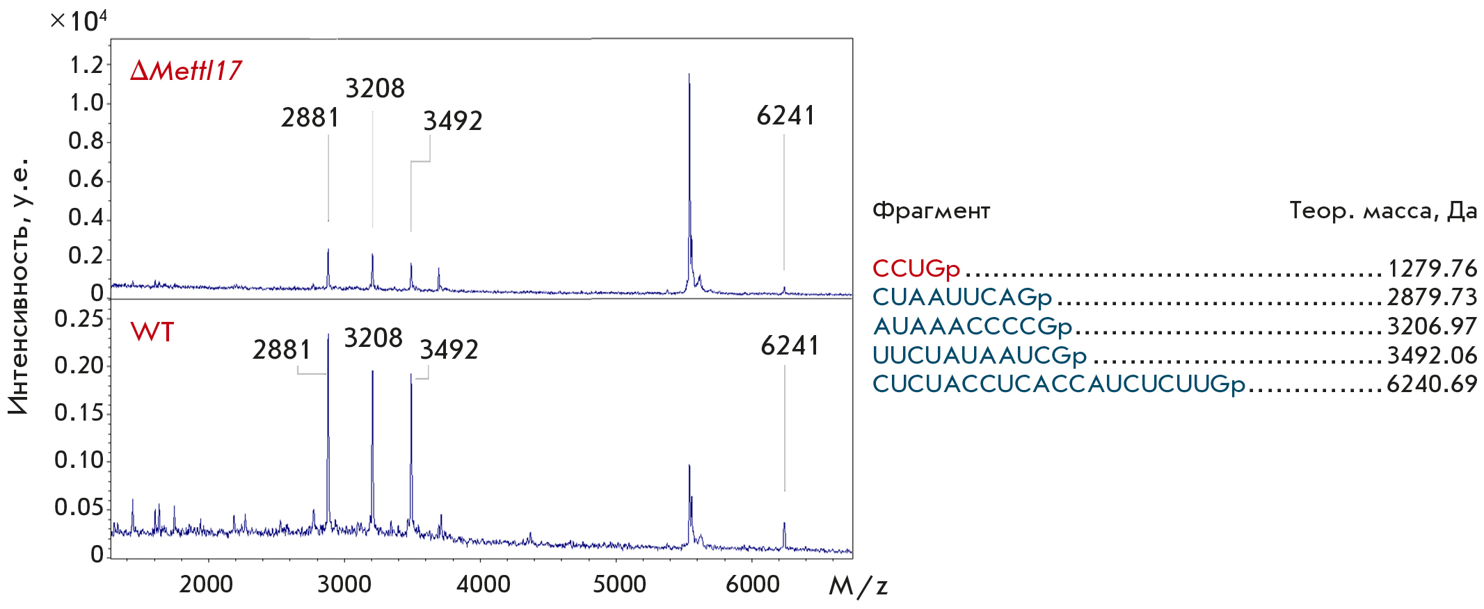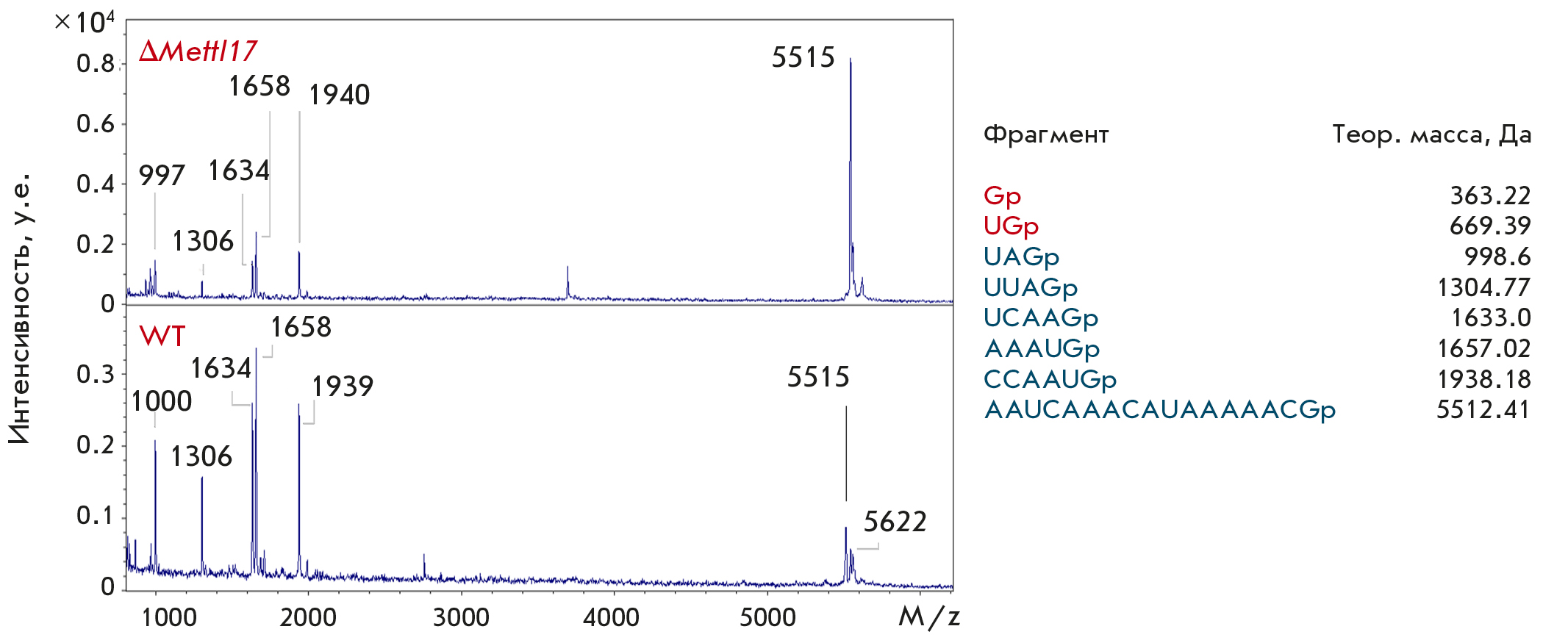 Fig. 7. Mass spectra of fragment 2 (peaks of RNA from the METTL17 knockout are shown at the top, those from the wild-type line are shown at the bottom). Mass spectra were acquired in linear mode. Theoretically calculated peaks for fragment 2 are labeled
