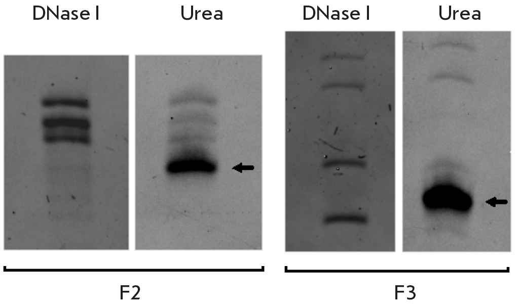 Fig. 5. Isolation of RNA fragments (F2, F3) on gel. Elution was performed using urea and DNase I. The DNA oligonucleotide eluted with urea is shown by an arrow
