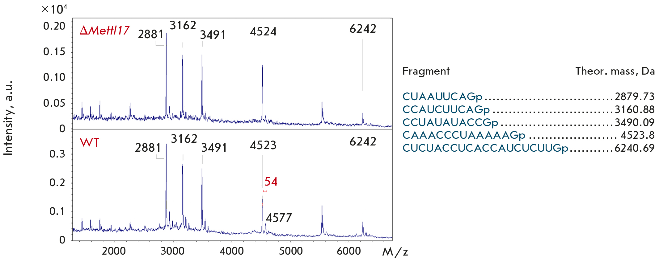 Fig. 6. Mass spectra of fragment 1 (peaks of RNA from the METTL17 knockout are shown at the top, those from the wild-type line are shown at the bottom). Mass spectra were acquired in linear mode. Theoretically calculated peaks for fragment 1 are labeled