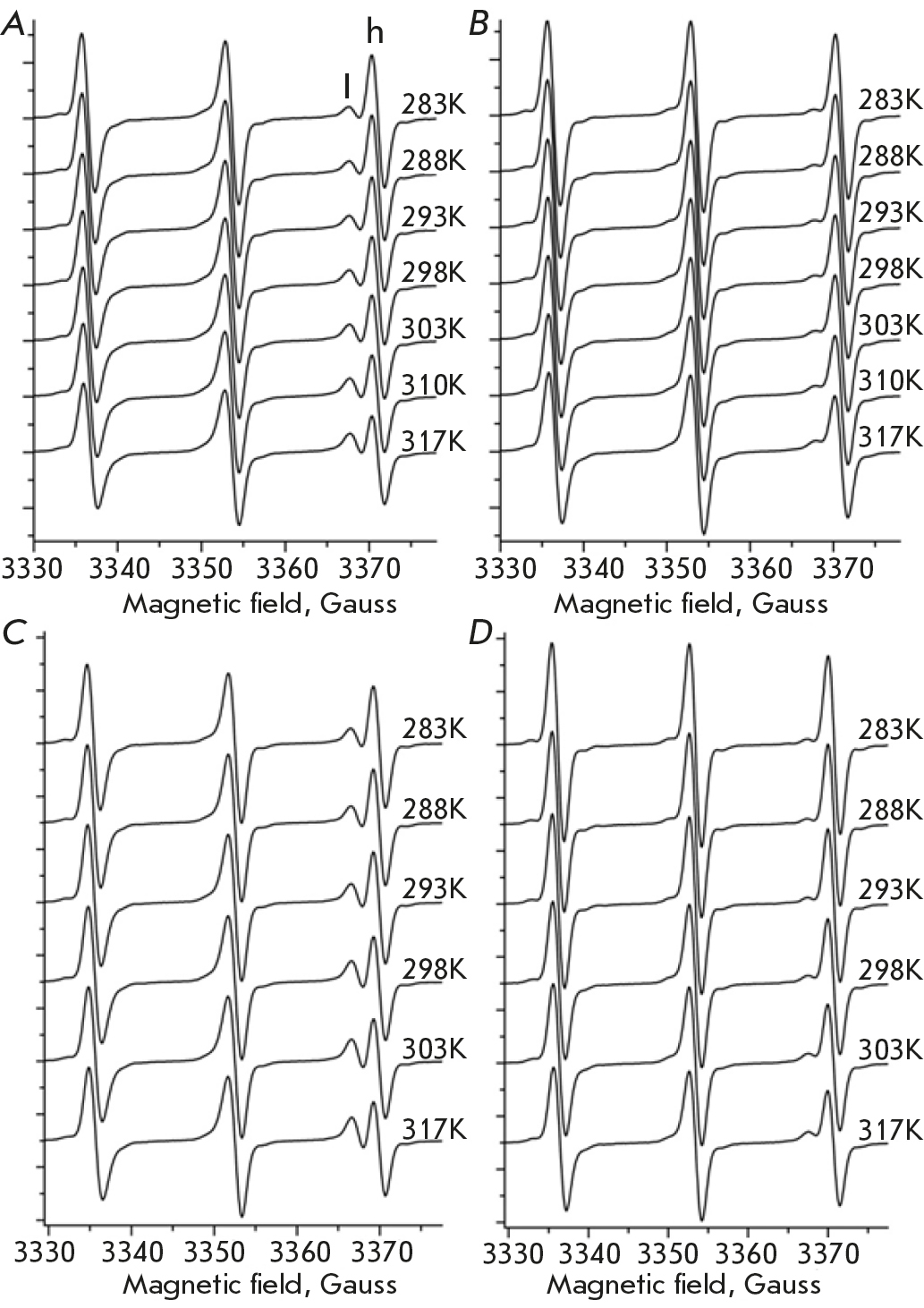 Fig. 2. EPR spectra of TEMPO resulted from the partitioning in the membranes of human lung normal and carcinoma cells. EPR spectra of TEMPO for carcinoma (A) and healthy (B) cells at pH 7.3 and at various temperature values. EPR spectra of TEMPO for carcinoma (C) and healthy (D) cells at pH 6.2 and at various temperature values. The l and h symbols denote the spectral components of the EPR spectra of TEMPO localized in lipophilic (cell membrane) and hydrophilic (aqueous) regions. The symbols l and h indicate the “lipophilic” and “hydrophobic” components of TEMPO, respectively. The temperature for each spectrum is shown in the Kelvin scale