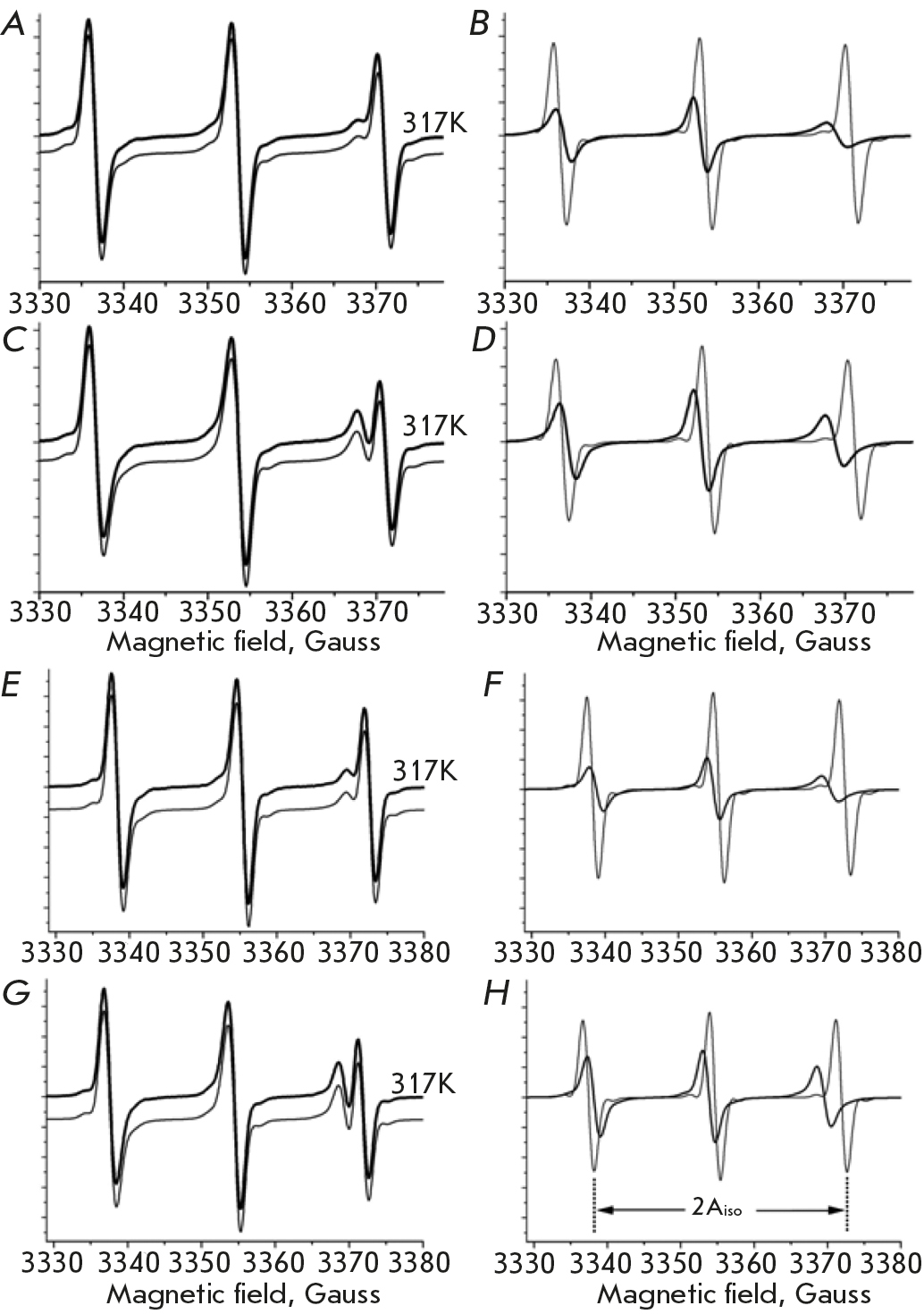 Fig. 3. Decompositions of the EPR spectra of TEMPO into components reflecting the lipophilic and hydrophilic environments. EPR spectra of TEMPO partitioning in human lung healthy and carcinoma cells at 317K and pH 7.3. (A) and (B) are the results of a two-component analysis (see Methods) and resolved components corresponding to lipophilic (sick line in B) and hydrophilic (thin line in B) for the healthy lung cells. The EPR spectrum from the fitting procedure (sick line in A) is indistinguishable from the experimental spectrum (thin line in A) and, therefore, vertically shifted for better illustration. (C) and (D) are the same as (A) and (D) but for the carcinoma cells. (E), (F), (G), and (H) indicate conditions corresponding to (A), (B), (C), and (D), respectively, but in pH 6.2. Aiso is the isotropic hyperfine coupling constant