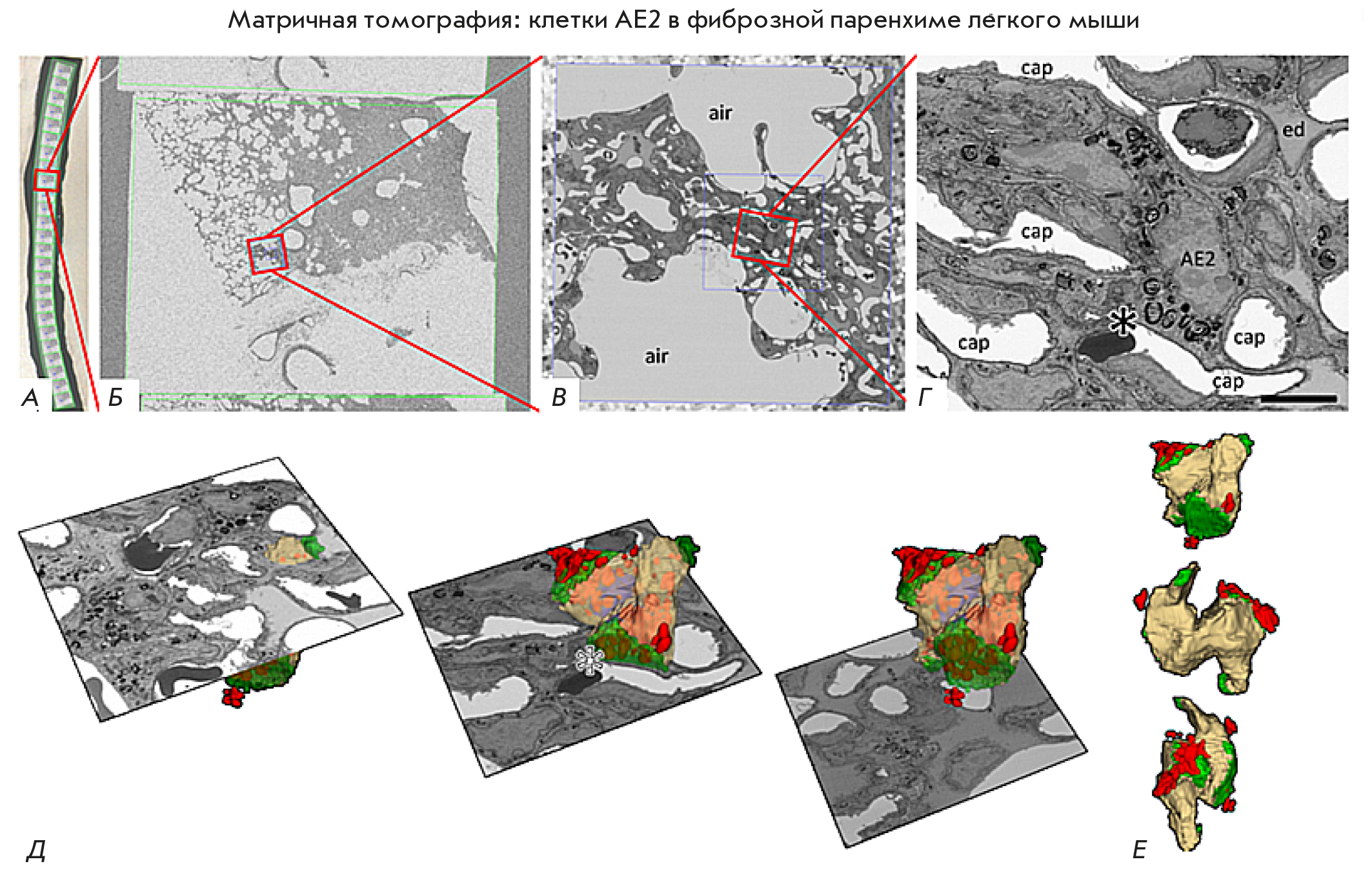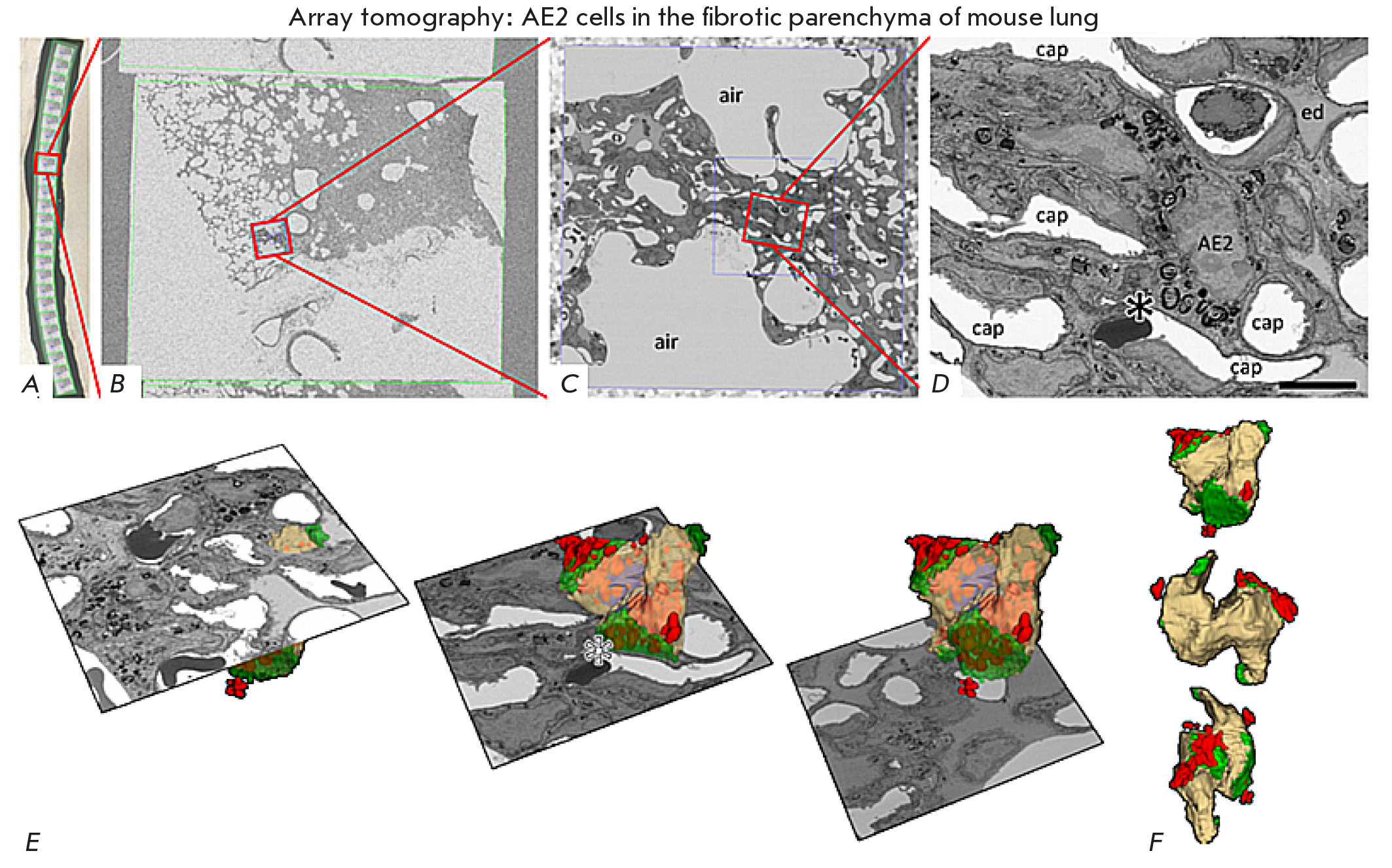 Fig. 4. An AT image of an AE2 cell in the fibrotic parenchyma of the mouse lung. (A–D) Sequential magnification of the SEM image from one of the sections of the tape (A). The asterisk on (D) corresponds to one AE2 cell in the fibrotic tissue area. Scale bar: 5 µm. (E) 3D reconstruction of the AE2 cell. Three separate cross-sectional planes from the sequence of recorded images are shown. (F) 3D reconstruction of the AE2 cell at different tilts. The figure was borrowed from ref. [6]