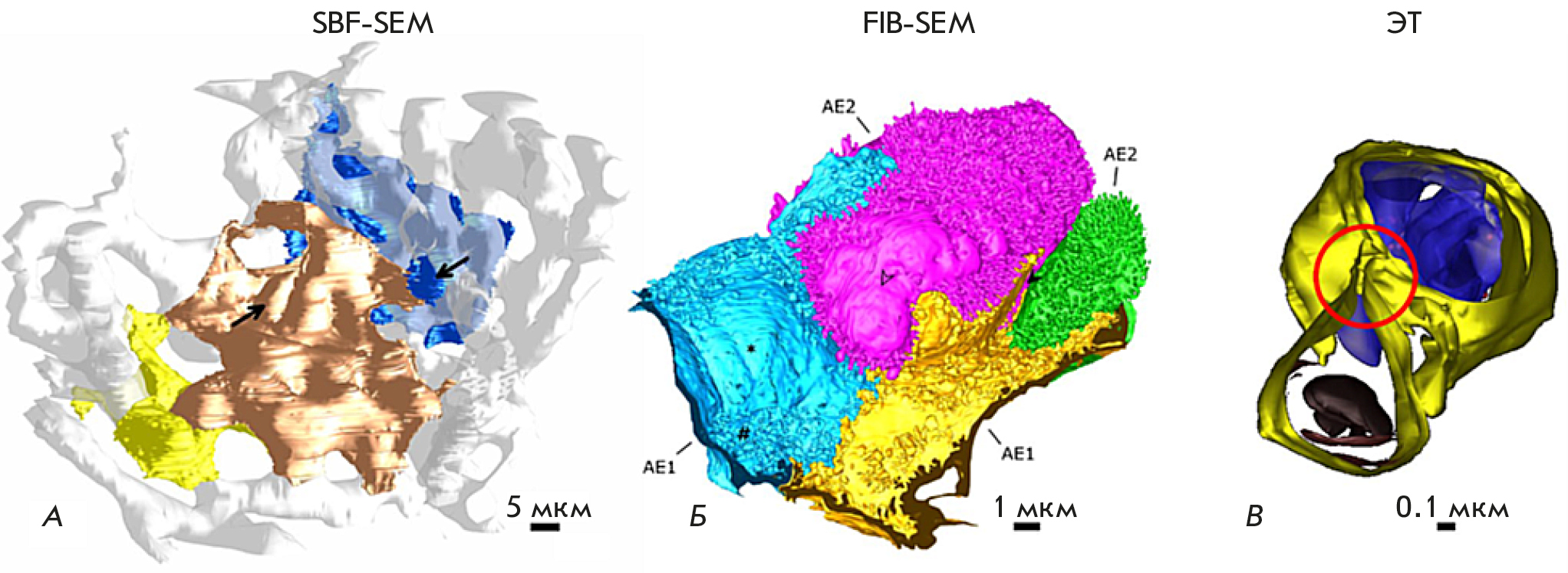 Fig. 5. 3D reconstructions obtained using serial block-face scanning electron microscopy (SBF-SEM), SEM with layer-by-layer etching with a focused ion beam (FIB-SEM), and electron tomography (ET). (A) 3D reconstruction of human alveolar epithelial type 1 cells (AE1) (yellow, gold, and blue) and the alveolar capillary network (white) based on the SBF-SEM dataset. Arrows indicate the position of the nuclei of AE1 cells. (B) 3D reconstruction of virtually the entire human alveolar epithelial type 2 (AE2) cell (pink) with portions of adjacent AE1 cell domains (blue and yellow) and an additional AE2 cell (green) based on the FIB-SEM dataset. (C) 3D reconstruction of the lamellar body (top) and the autophagosome (bottom) inside an AE2 cell (mouse lung) based on the ET dataset. Separate lipid membranes are distinguishable, which in this case is indicative of a connection of two organelles (a red circle). The figure was taken from ref. [6]